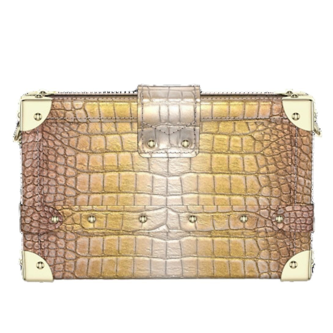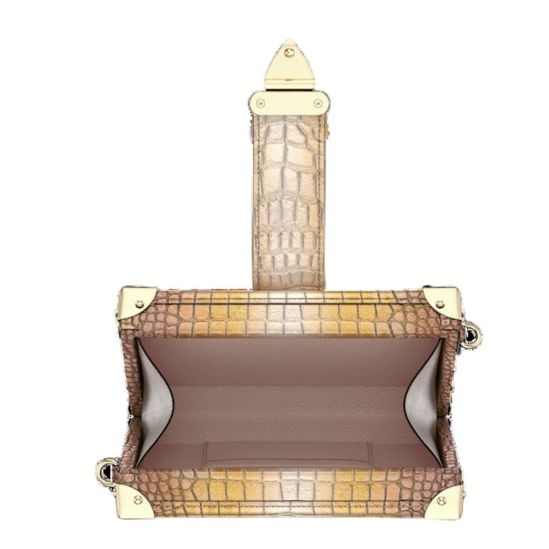 Measuring 7.9 x 4.9 x 2 inches, the LOUIS VUITTON PETITE MALLE epitomizes compact chic, offering both style and functionality in equal measure. Adorned in brilliant alligator leather with matching trim, its opulent Golden Hour hue radiates warmth and refinement, perfectly complemented by the plush sheepskin lining.