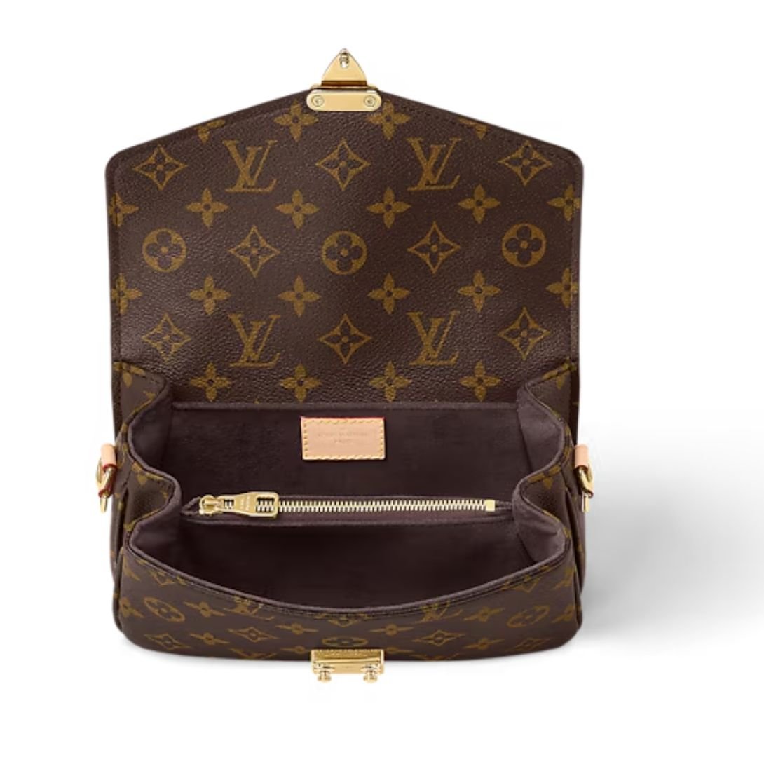 Measuring 8.5 x 5.3 x 2.4 inches (Length x Height x Width), the Pochette Métis East West is compact yet roomy enough to hold your essentials. It features three inside compartments, a zipped pocket inside, and an additional zipped pocket outside for easy access to smaller items. It fits a smartphone, Rosalie Coin Purse, keys, and lipstick, offering both style and practicality.