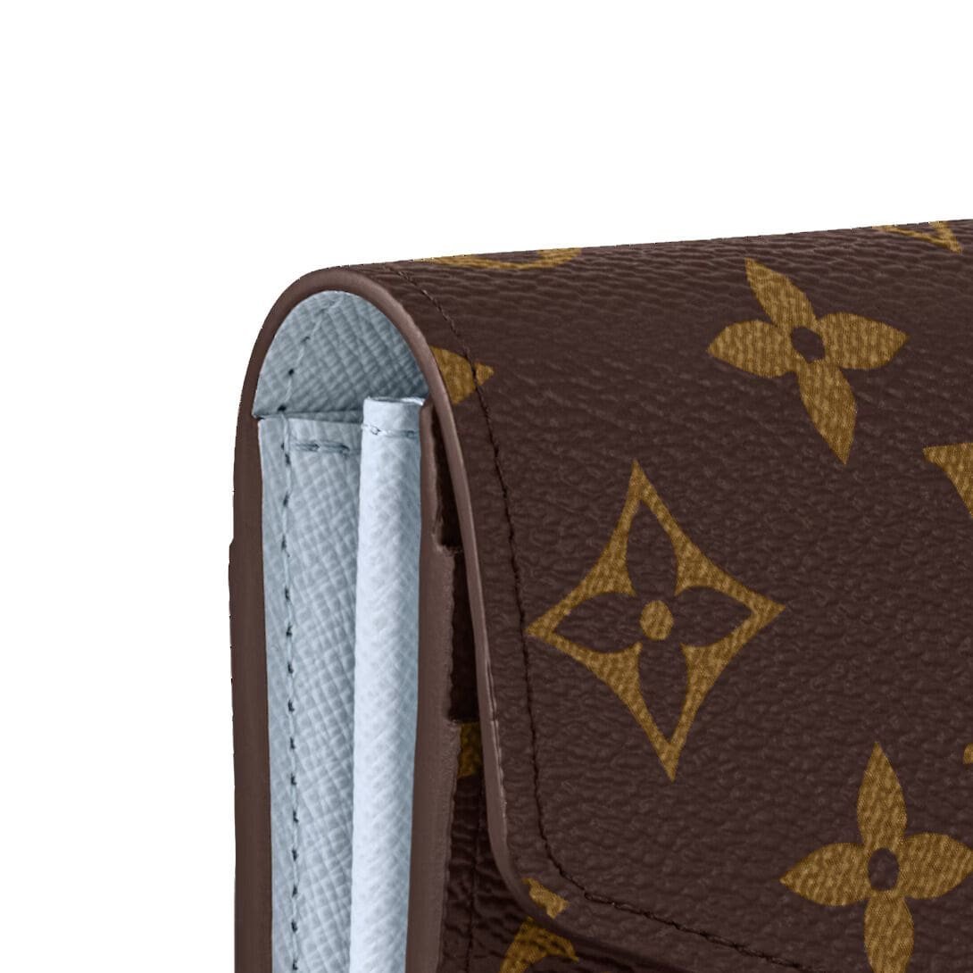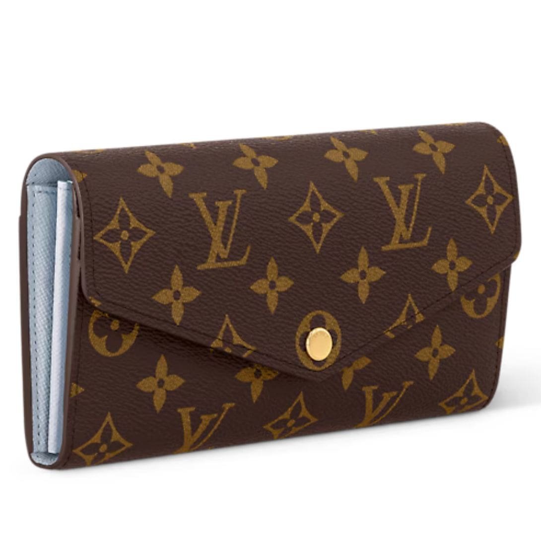 This edition’s LOUIS VUITTON SARAH WALLET perfectly marries Louis Vuitton’s iconic Monogram canvas with a sophisticated pastel Olympe Blue leather lining. This classic wallet stands out for its refined rectangular shape and elegant envelope-style flap, securely closed with an engraved, gold-tone press-stud.