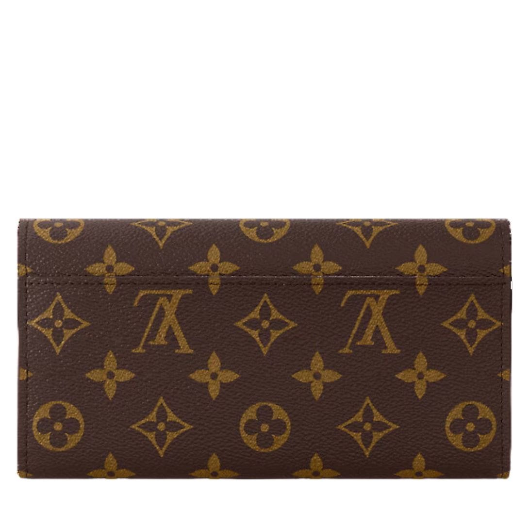The LOUIS VUITTON SARAH WALLET is designed for both style and practicality, measuring 7.5 x 4.1 x 0.8 inches (length x height x width). The exterior is crafted from durable Monogram coated canvas, while the interior features a luxurious-grained cowhide leather lining. The gold-color hardware adds a touch of opulence, making this wallet a timeless accessory.