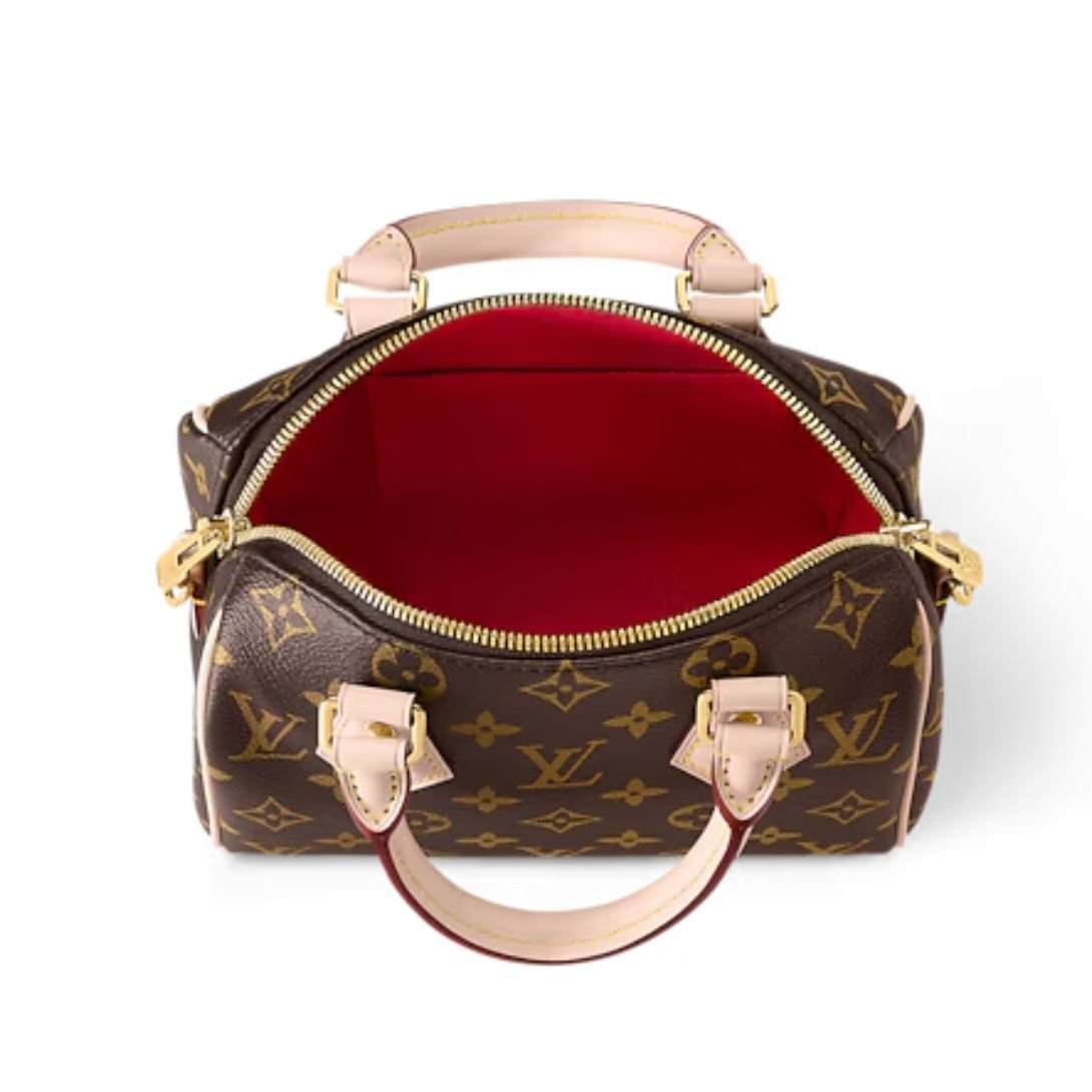 The Speedy Bandoulière 20 offers a refined reinterpretation of Louis Vuitton’s iconic Speedy travel bag in a compact, city-ready format. Crafted in Monogram coated canvas and trimmed with natural cowhide leather, this sleek version features gold-color hardware and a bold red textile lining for a sophisticated finish.