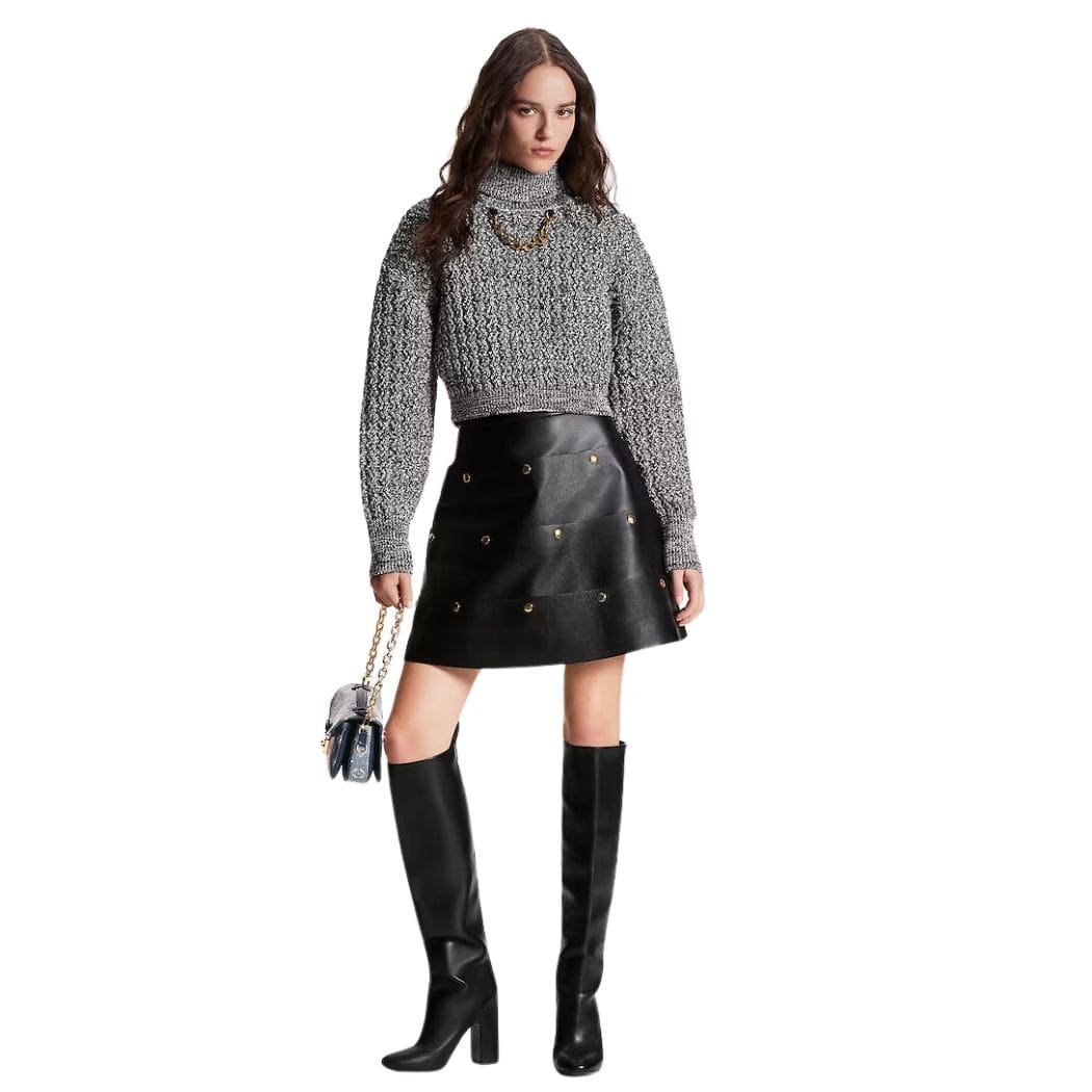 Elevate your wardrobe with this season’s statement piece: Louis Vuitton Tiered Snap Button Leather Skirt adorned with signature decorative snap buttons, imbuing it with a rebellious trompe l’oeil tear-away aesthetic. Crafted from luxurious lambskin leather, the staple A-line silhouette takes on a sophisticated edge, enhanced by its soft texture and lustrous finish.