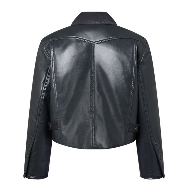 Adjustable buckle details at the back lend a rebellious biker feel to the jacket, adding an edgy touch to its refined silhouette. These subtle details further elevate the design, ensuring that it stands out as a statement piece in any ensemble.