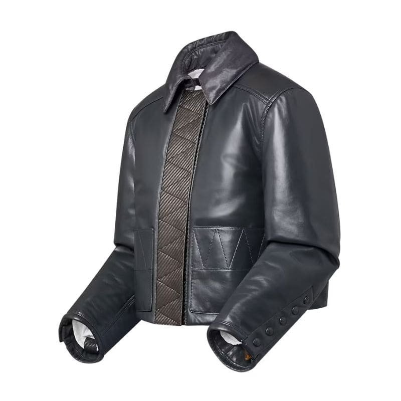 The Louis Vuitton Topstitched Leather Boxy Jacket epitomizes modern sophistication with its sleek silhouette and structured design. Crafted from luxurious lambskin, this jacket features the collection’s signature boxy, genderless shape, accentuated by a chic collar that adds a touch of elegance to its overall aesthetic.