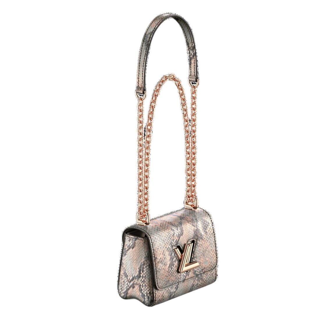 With dimensions of 6.1 x 4.9 x 2.8 inches, the LOUIS VUITTON TWIST MINI is the epitome of versatility, making it the perfect companion for evening soirées. Its compact size belies its functionality, offering the option of shoulder or crossbody wear with its sliding chain adorned with a python leather pad, ensuring effortless transitions from day to night.