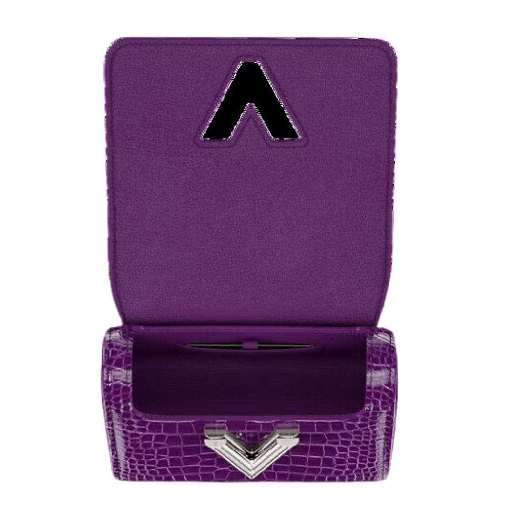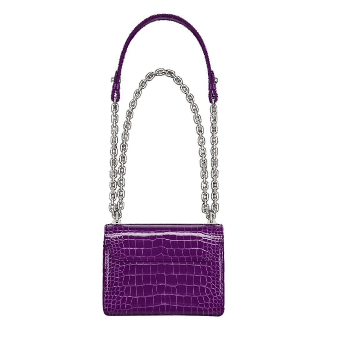 Measuring 7.5 x 5.9 x 3.5 inches, the LOUIS VUITTON TWIST PM CHAIN is meticulously designed to offer both style and functionality. Its amethyst purple hue exudes opulence, perfectly complemented by brilliant alligator leather trim and silver-color hardware accents, creating a striking visual statement.