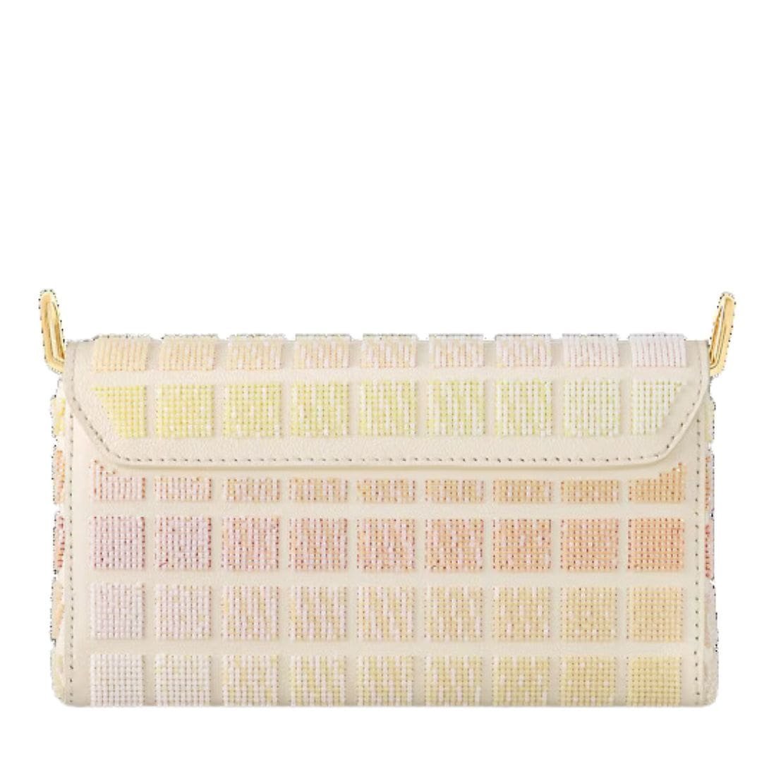 Introducing the LOUIS VUITTON TWIST WEST  Handbag—an epitome of luxury and versatility. Crafted from leather intricately embroidered with beads, it showcases an ombré version of the House’s iconic Damier pattern in soft pastel tones. This ultra-compact bag, measuring at 9.3 x 4.7 x 2.8 inches, is designed to accommodate your essential belongings in style.