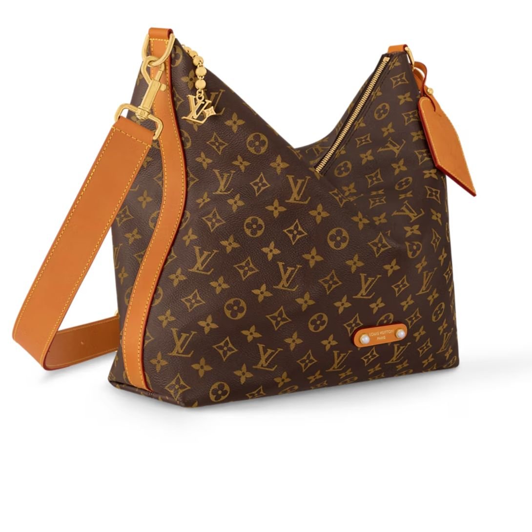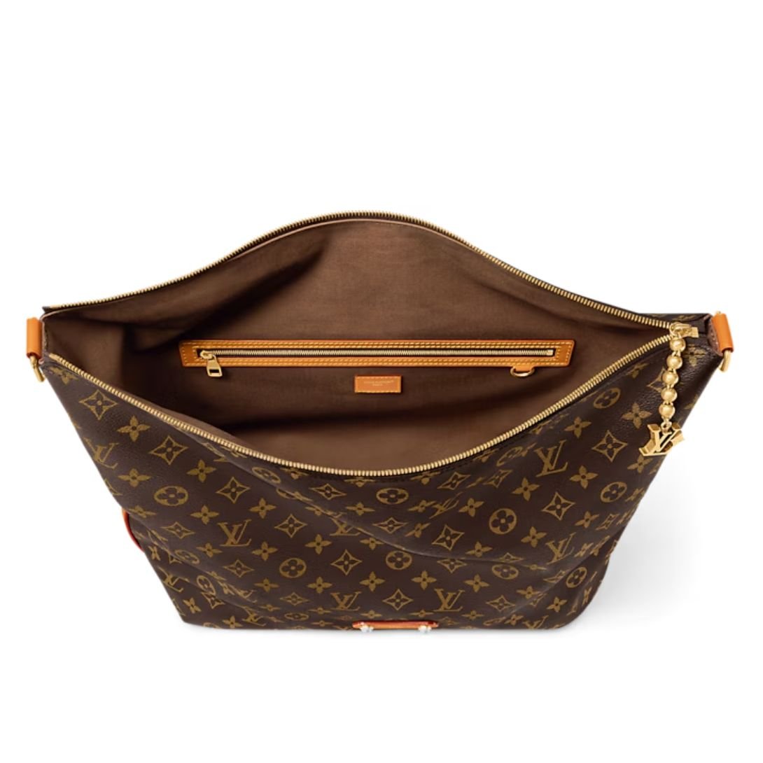 The Vagabond Hobo bag showcases a distinctive crescent silhouette crafted in supple Monogram coated canvas. Its relaxed shape pairs comfort with iconic style, while aged natural cowhide-leather trim and gold-toned hardware add a vintage-inspired touch. A removable leather name tag and an LV charm on a gold-toned ball chain enhance the bag’s elegant, timeless appeal.