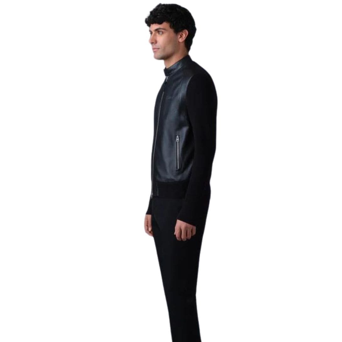 Introducing The Mackage Dominic Knit Mixed-Media Jacket is a mixed-media jacket made from supple leather and wool knit.Cut to a regular fit.Soft knit sleeves with leather front and stand collar offer a bold look and comfortable feel.Center front zip closure and rib knit cuffs and hem trap in warmth.Dual zip pockets provide ample storage.Signature “MACKAGE” debossed logo at chest adds subtle flair.A multi-seasonal piece with modern appeal.