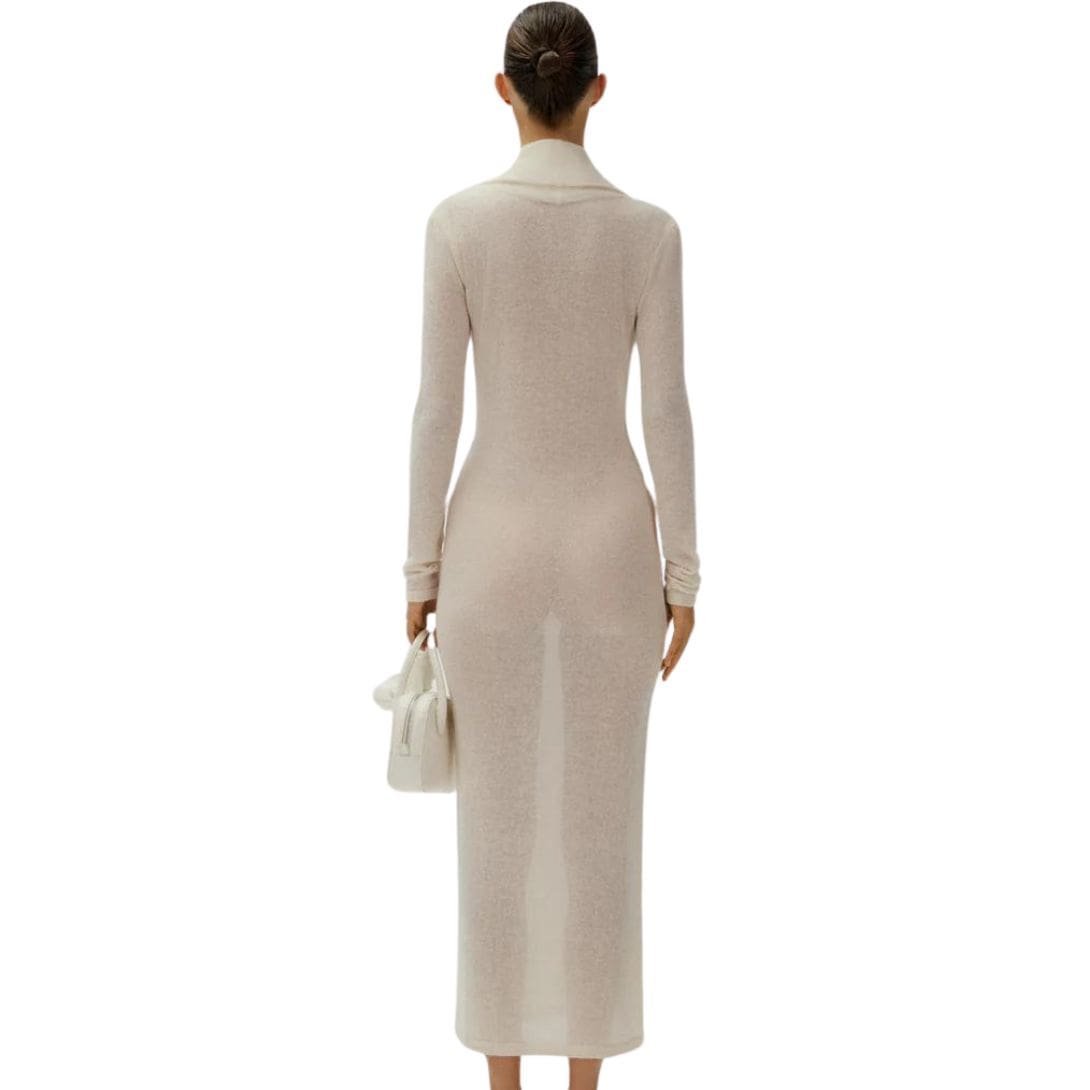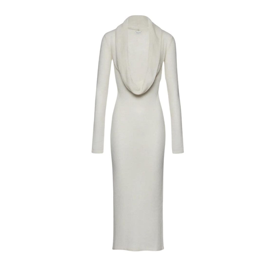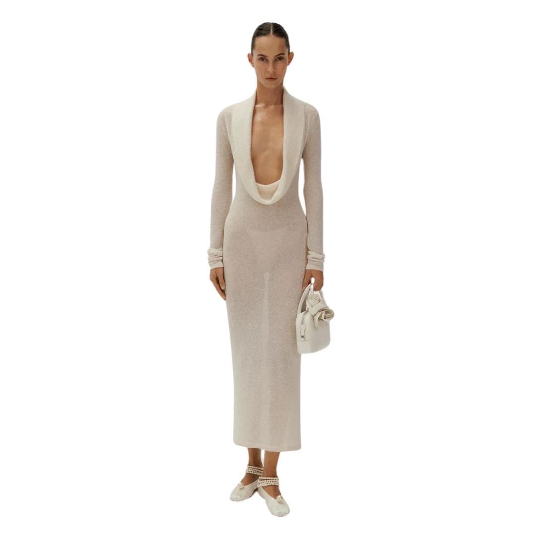Magda Butrym boucle knit cowl neck dress in cream in cream epitomizes elegance, meticulously crafted from lightweight cotton bouclé knitwear fabric. This fabric choice imbues the dress with a soft, textured feel that enhances its luxurious appeal.
