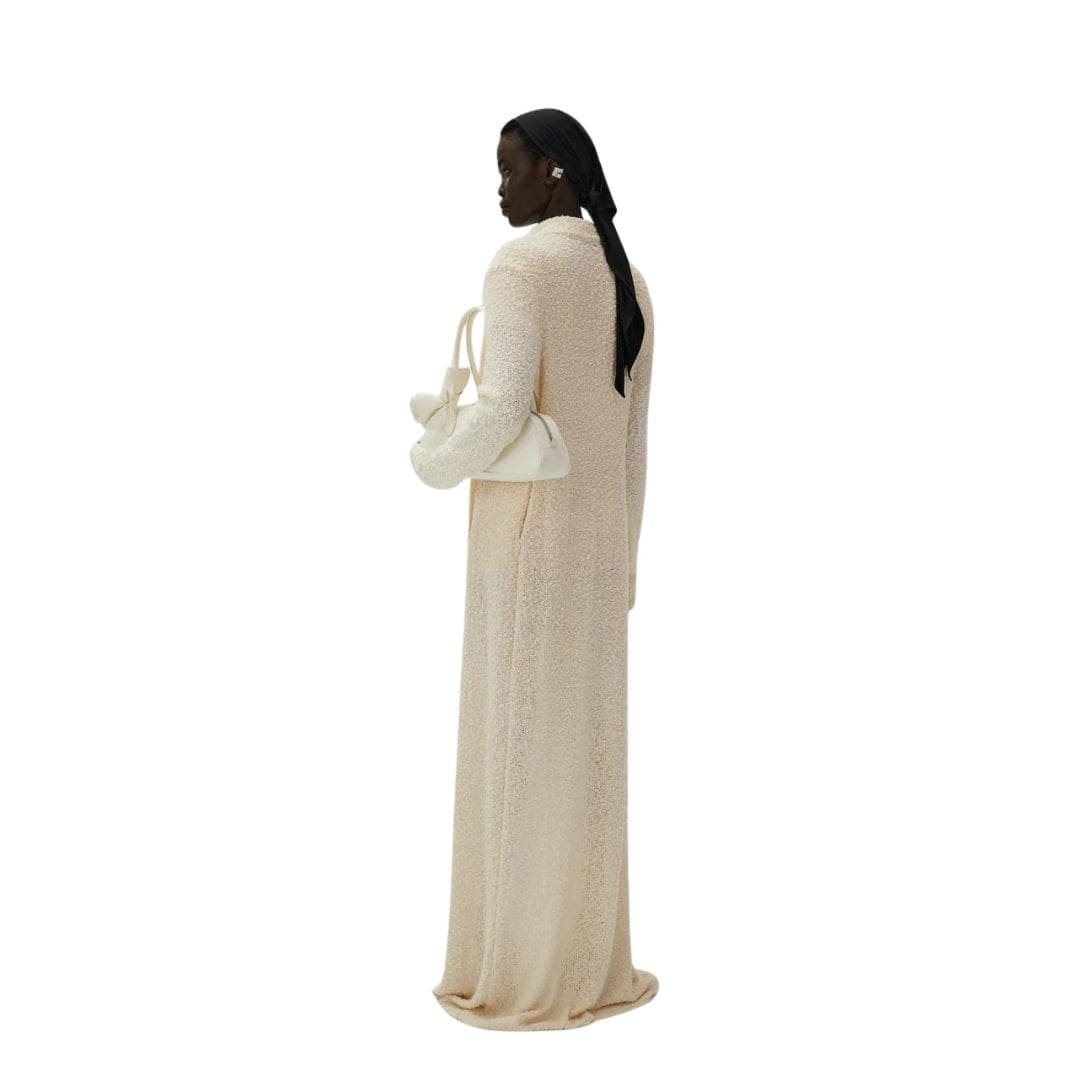 Magda Butrym boucle knit duster cardigan in cream combines classic charm with contemporary flair, featuring a round neck and a single pearl button closure. This cardigan is crafted from a textured cotton bouclé knit, which adds depth and visual interest to its design.