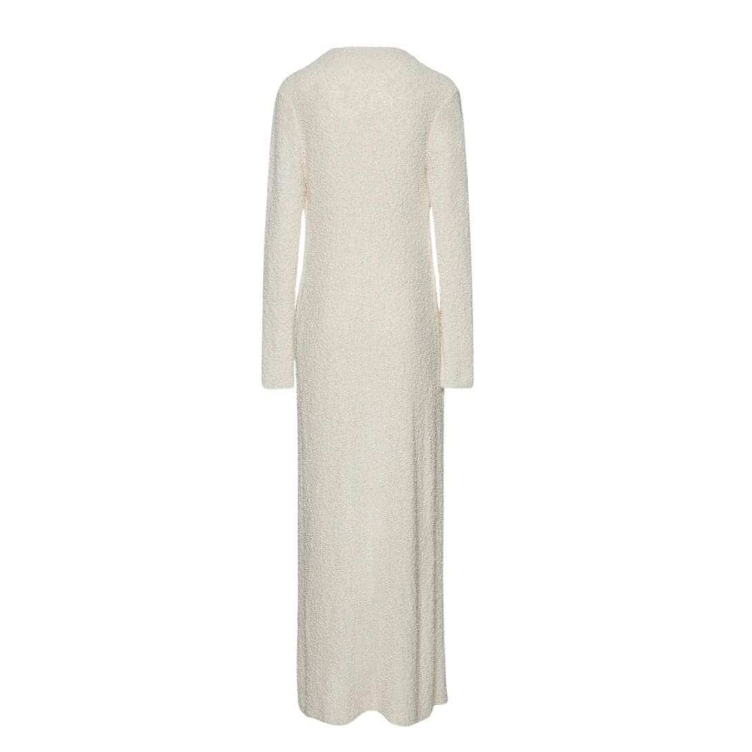 Overall, Magda Butrym’s bouclé knit duster cardigan in cream is a versatile wardrobe staple. Its blend of classic design elements, such as the round neck and pearl button closure, with modern fabric texture ensures it remains a timeless piece. Ideal for adding an elegant layer to any ensemble, this cardigan promises both comfort and chic sophistication.