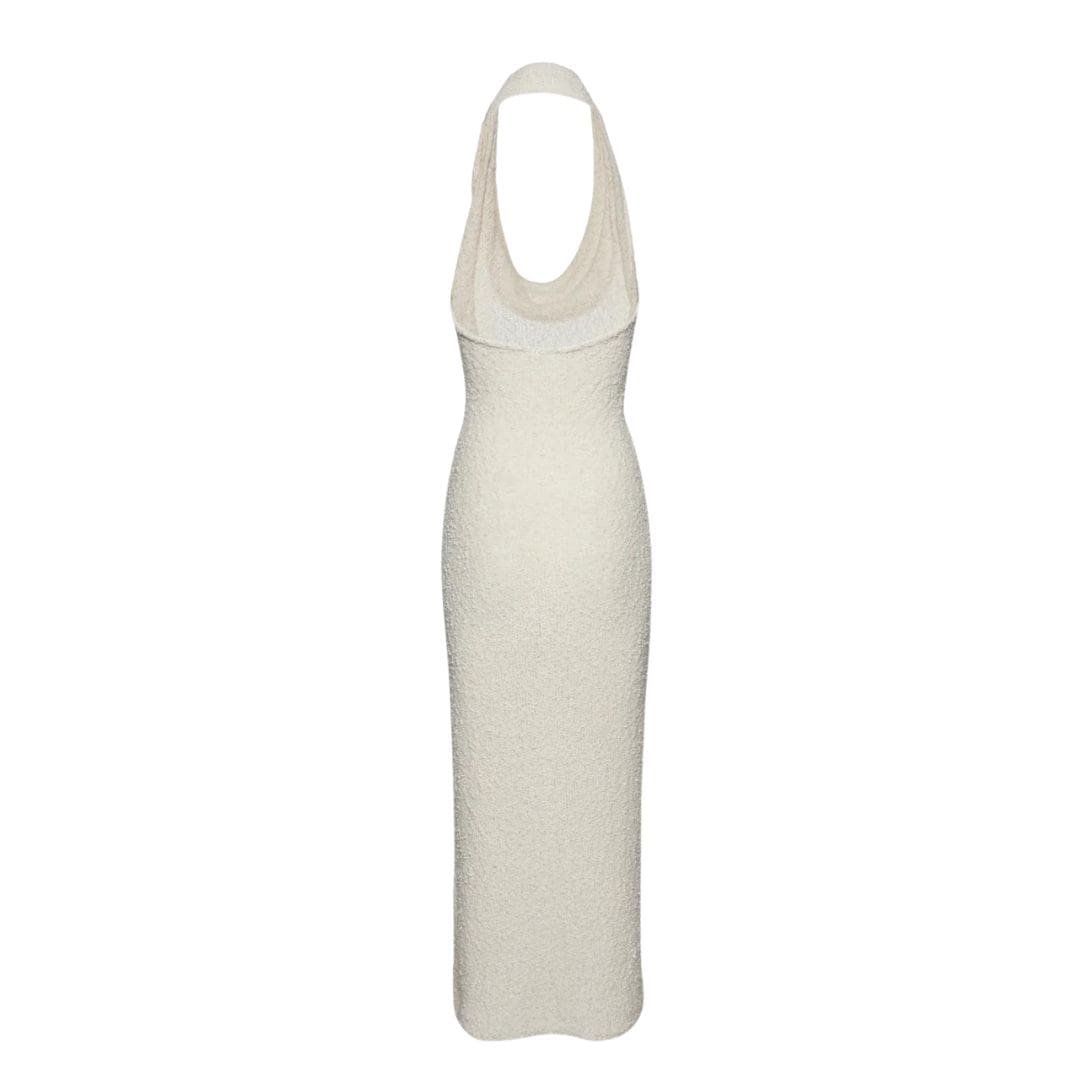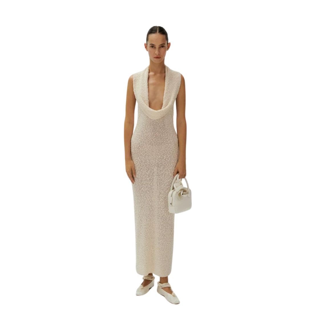 Magda Butrym boucle knit midi halter dress in cream epitomizes modern elegance, crafted from lightweight cotton bouclé knit. The dress features a distinctive halter neckline that elegantly frames the shoulders and a cowl neck design that adds a touch of sophistication to the front.