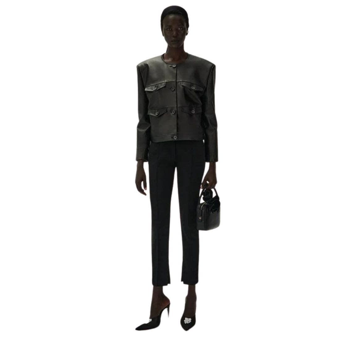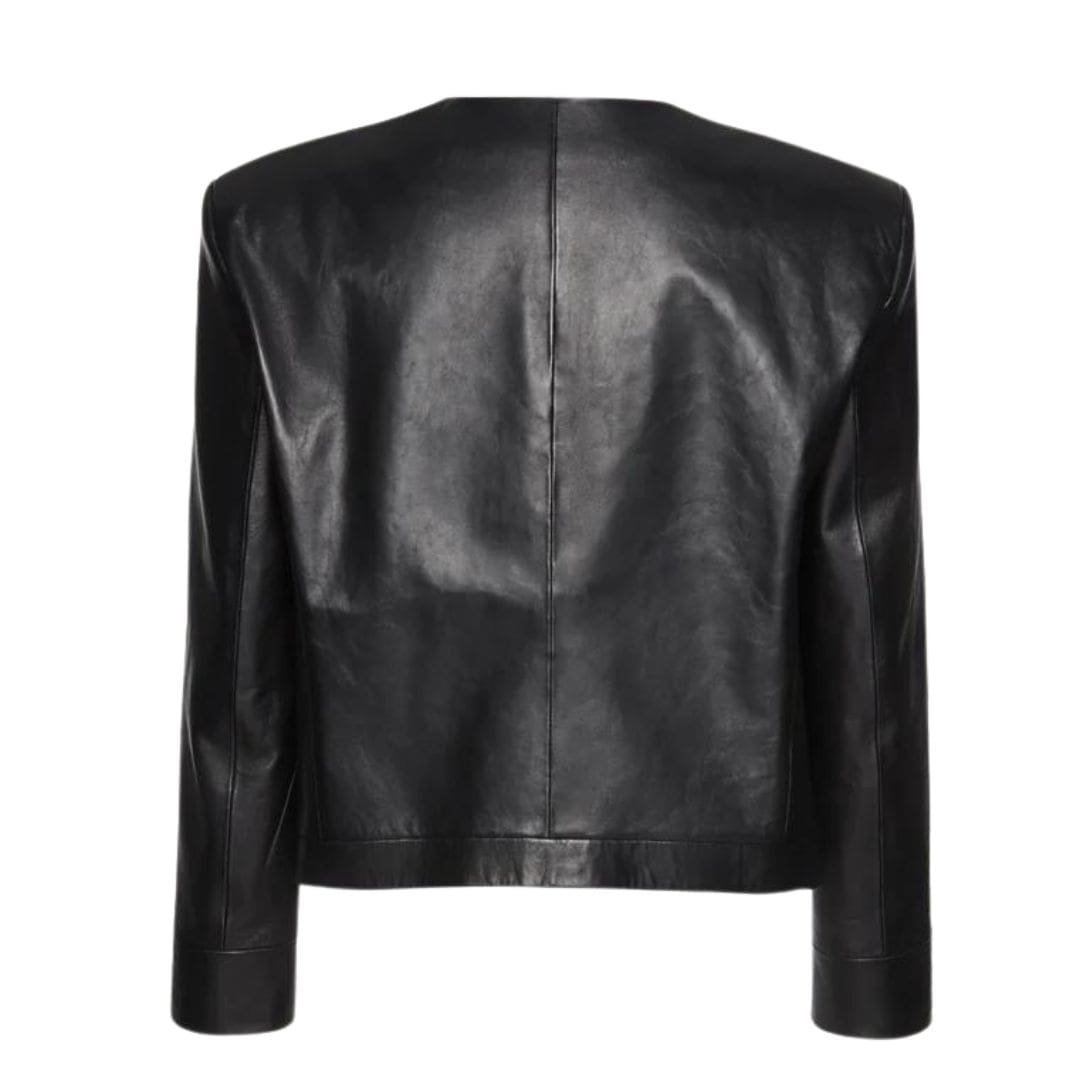 Crafted from luxurious leather, this jacket embodies the epitome of quality craftsmanship. The supple texture of the leather not only adds a touch of opulence but also ensures durability, promising years of stylish wear. Its semi-fitted design flatters the figure without compromising on comfort, striking the perfect balance between structure and ease of movement.
