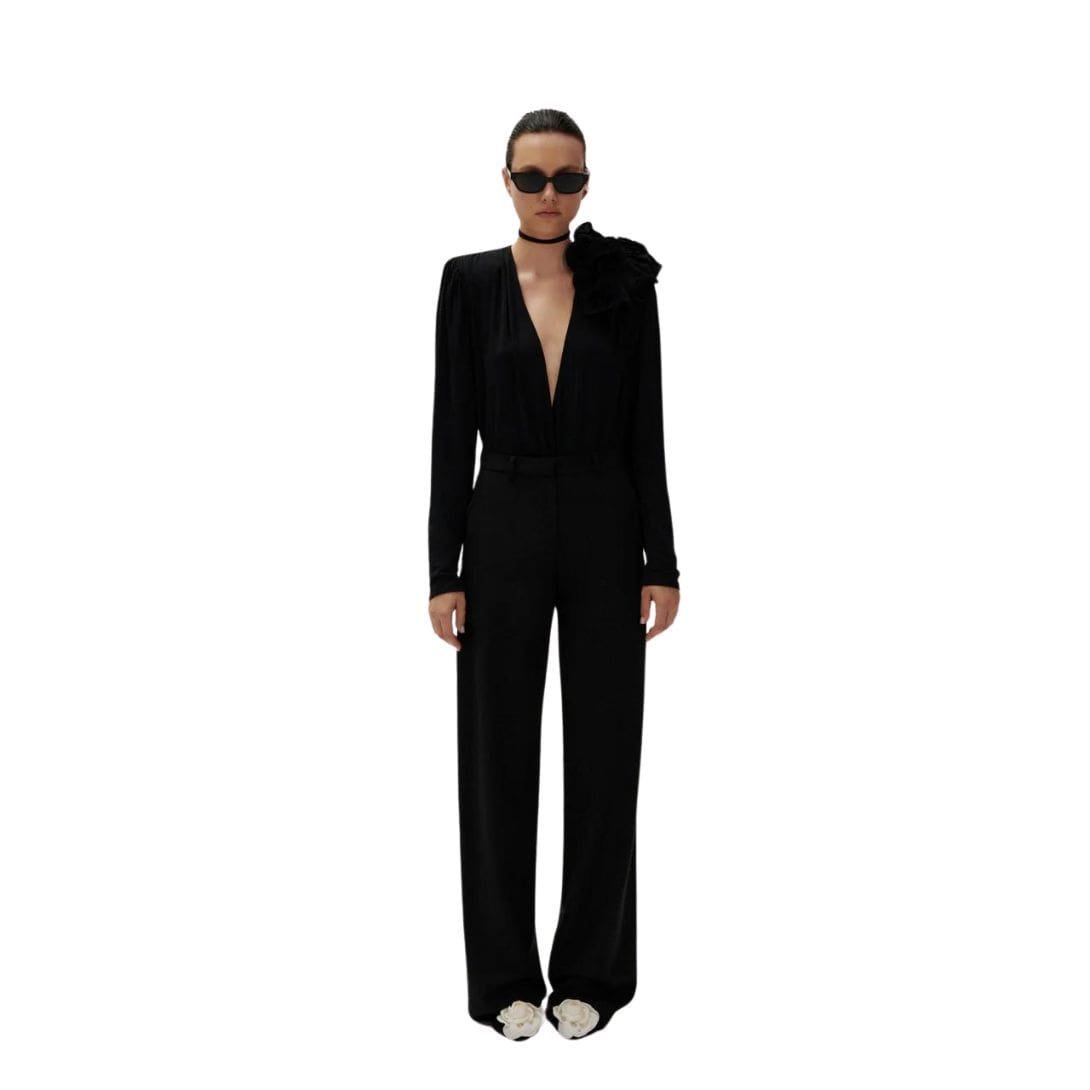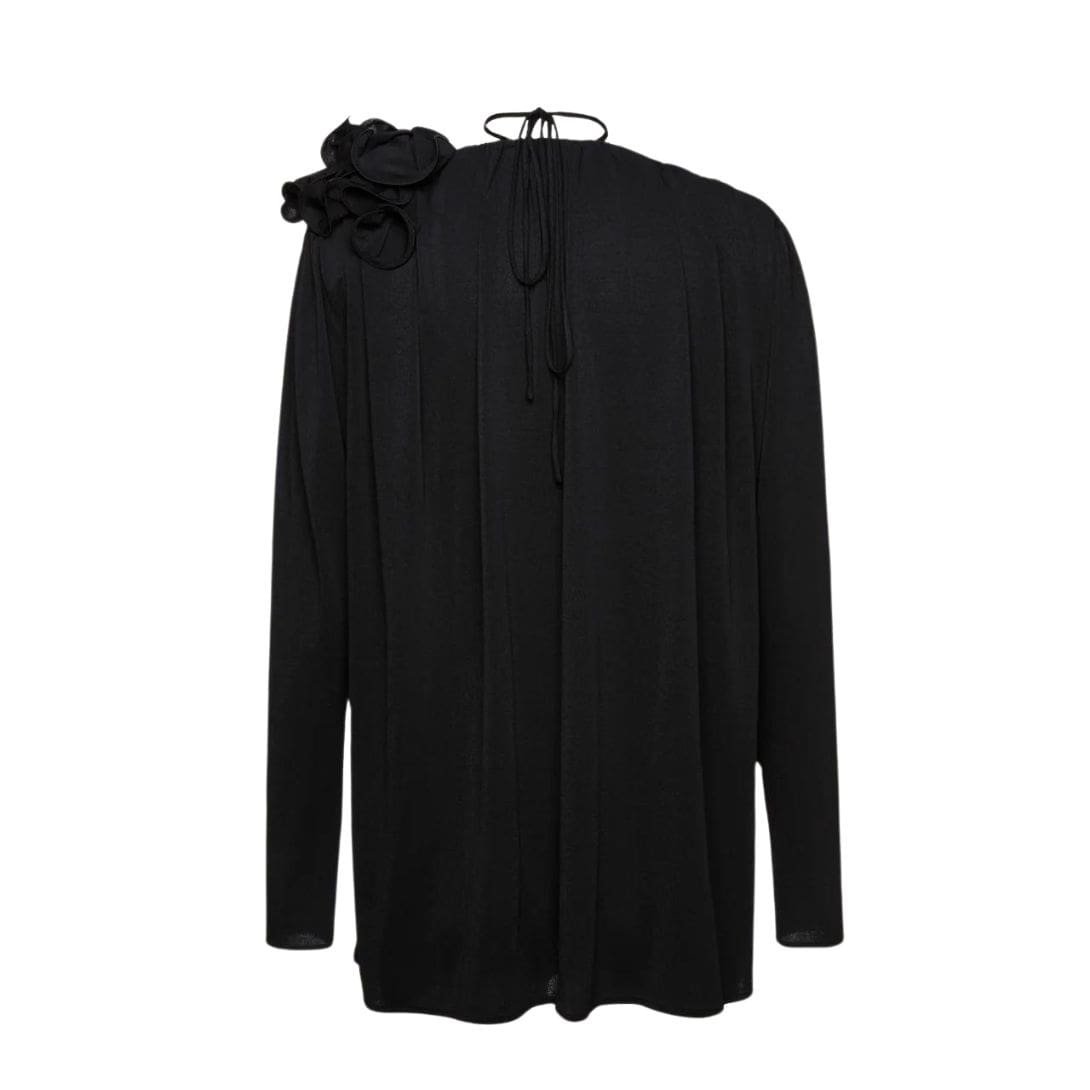 Magda Butrym Classic Jersey Flower Blouson In Black is an embodiment of romantic elegance and contemporary style. This classic piece features a billowing silhouette that adds a touch of whimsical charm to any outfit. The v-neckline is both flattering and sophisticated, complemented by a concealed button closure that ensures a seamless and polished appearance.