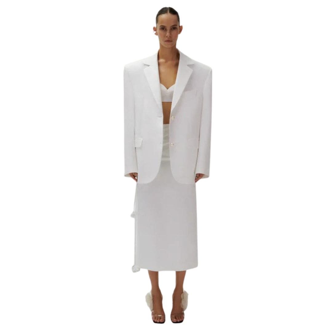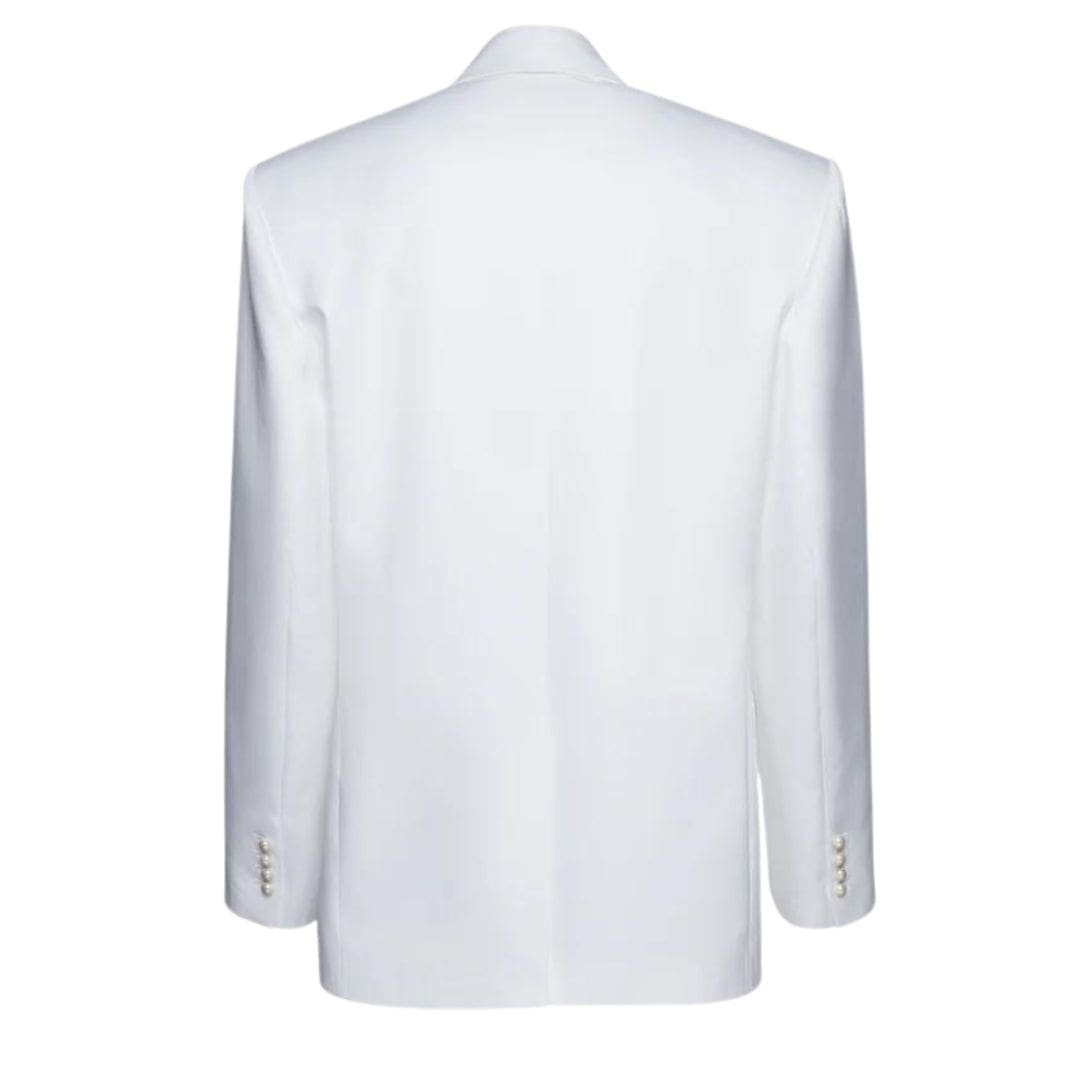 In summary, the Magda Butrym Classic Oversized Cotton Blazer in White is a versatile and sophisticated piece that effortlessly combines modern design with timeless elements. Its strong shoulders, peak lapels, and oversized fit create a chic and powerful look, while the lightweight cotton fabric and pearl buttons add a fresh and luxurious touch. Whether dressed up for a formal occasion or worn casually, this blazer is sure to elevate any outfit with its impeccable style and craftsmanship.