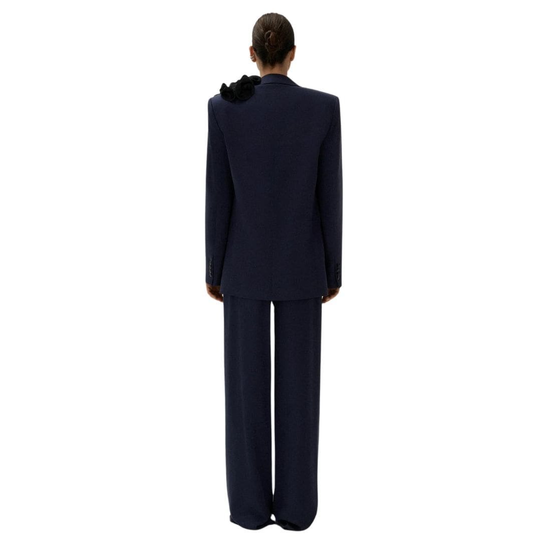 MAGDA BUTRYM CLASSIC OVERSIZED CUPRO BLAZER IN NAVY is a contemporary icon, renowned for its striking silhouette and impeccable tailoring. Characterized by strong shoulders, peak lapels, and a boyfriend fit, this timeless piece exudes confidence and sophistication. In its latest iteration, the classic blazer receives a modern update, crafted from a luxurious cupro fabric with a single-button closure, offering a lightweight wardrobe option with an elegant finish.