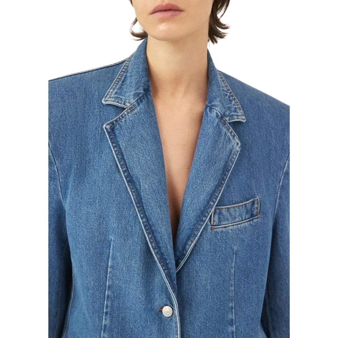 Strong shoulders are a signature element of Magda Butrym’s blazers, and this denim version is no exception. The padded shoulders add structure and a touch of drama to the overall silhouette, creating a powerful and confident look. This detail not only enhances the blazer’s modern aesthetic but also ensures a polished and sophisticated appearance.