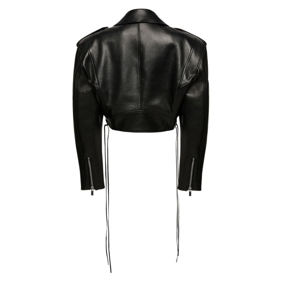 At the heart of the jacket lies its distinctive cropped silhouette, which offers a modern twist on the timeless biker aesthetic. This abbreviated length not only adds a sense of youthful exuberance but also allows for effortless layering, making it the perfect companion for both casual outings and evening soirées alike.
