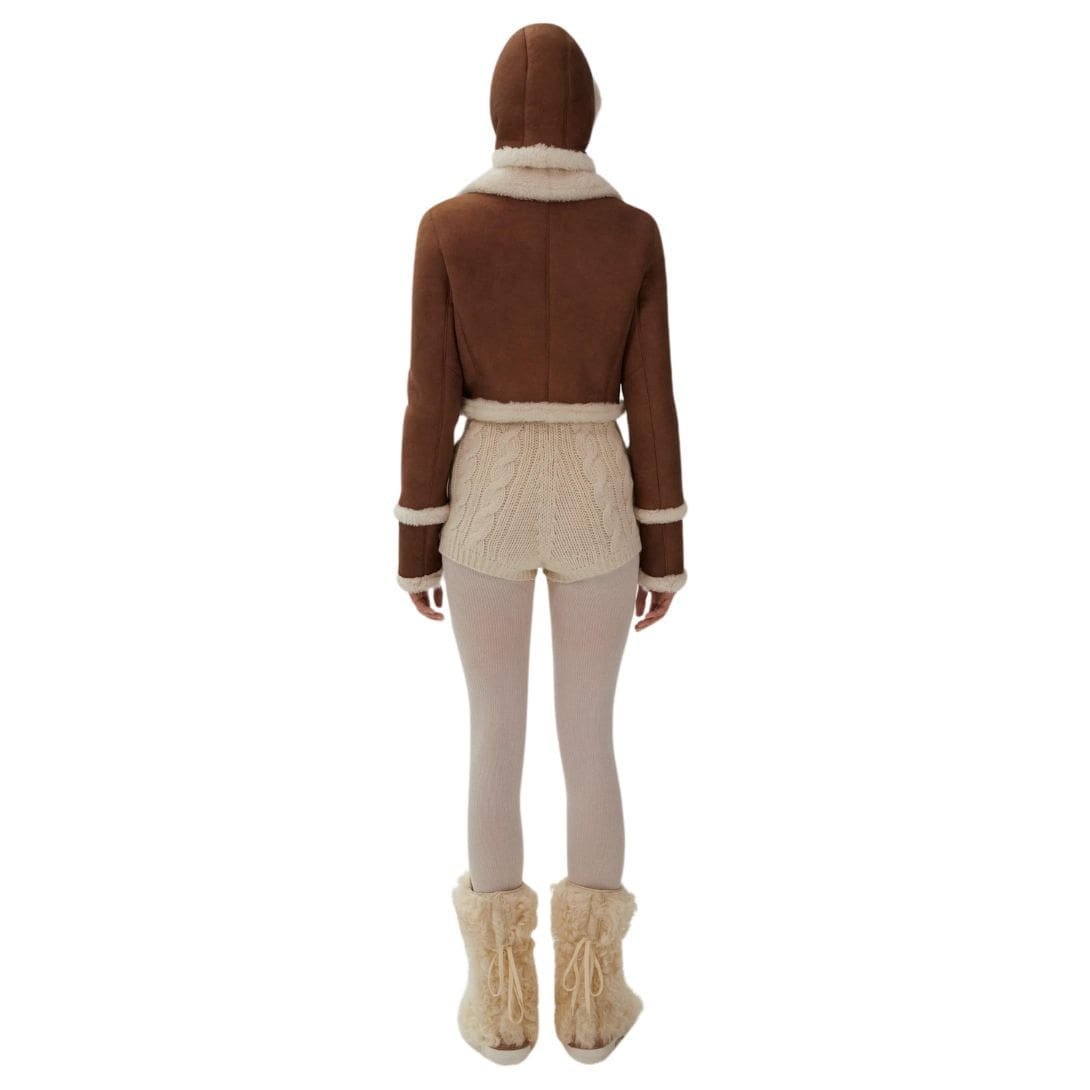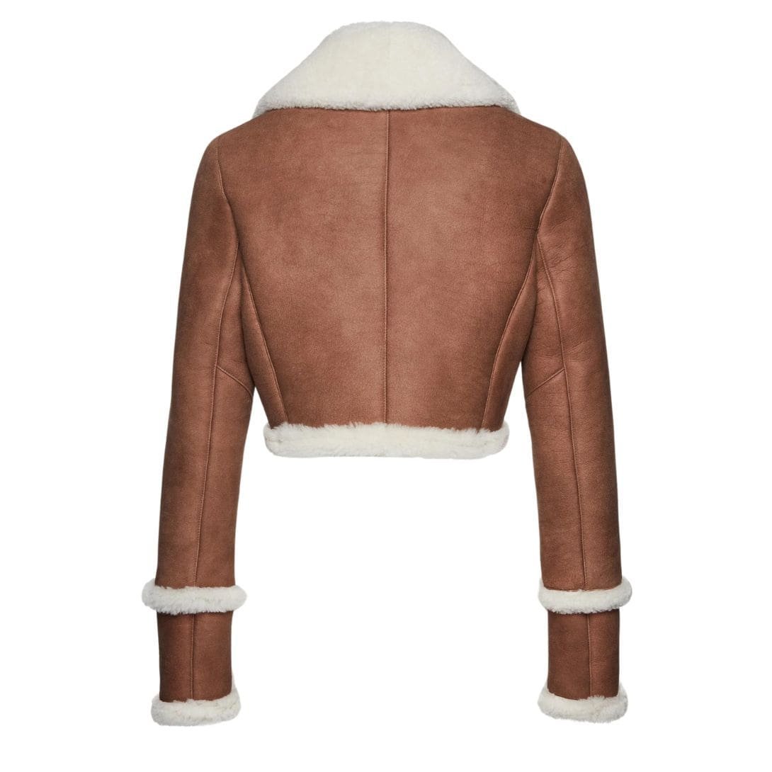 In a timeless beige hue, this cropped shearling jacket is a versatile wardrobe staple that transcends trends and seasons. Whether layered over a dress for a night out or paired with jeans and a sweater for a casual weekend look, it adds a touch of luxury and sophistication to any outfit.