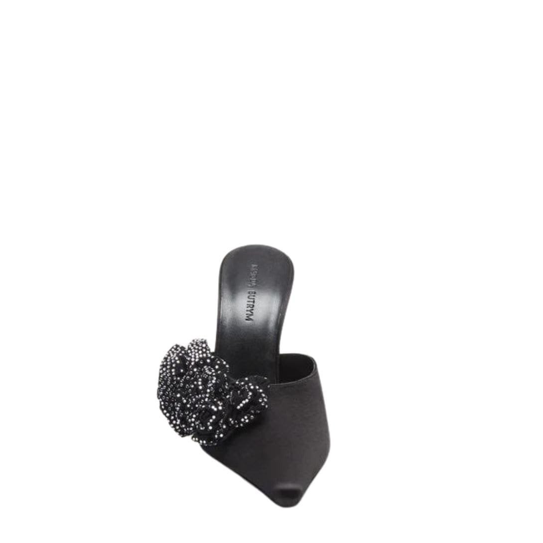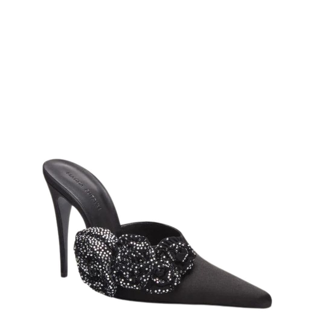 MAGDA BUTRYM CRYSTAL FLOWER APPLIQUE POINTED MUSLES IN BLACK SATIN