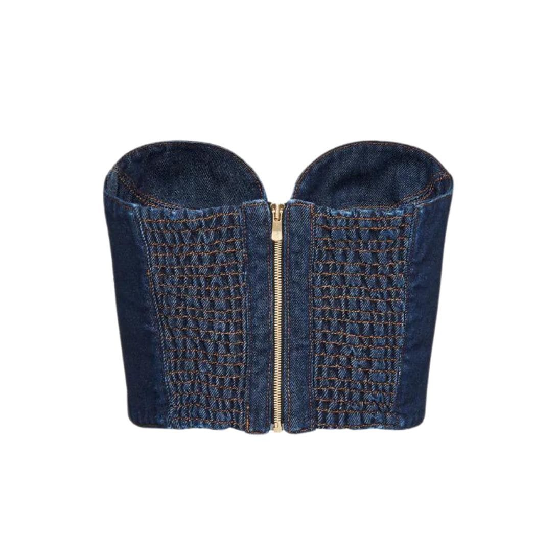 The indigo hue of the denim enhances its versatility, allowing the corset top to be styled in various ways. Pair it with high-waisted jeans for a cohesive denim-on-denim look, or team it with a flowing skirt for a contrasting ensemble. The cropped length makes it ideal for layering or wearing alone, offering endless styling possibilities from day to night.