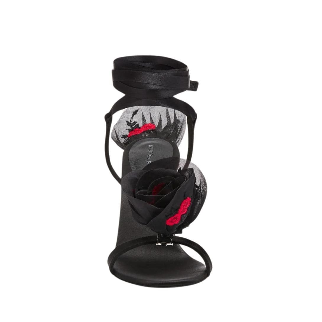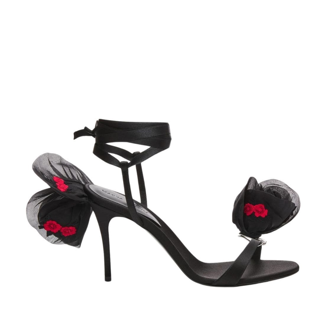 MAGDA BUTRYM DOUBLE EMBROIDERY FLOWER HEEL SANDALS IN BLACK SATIN