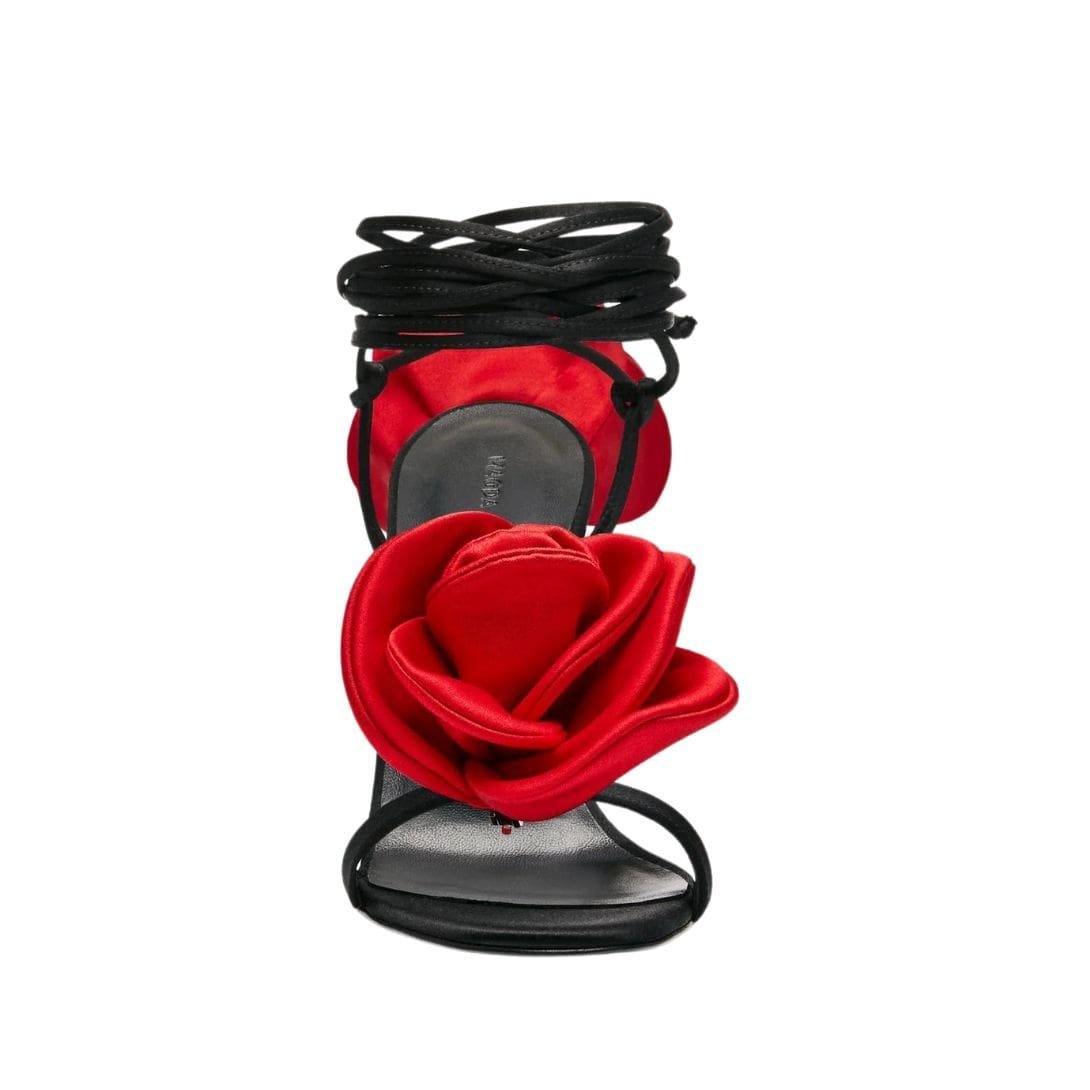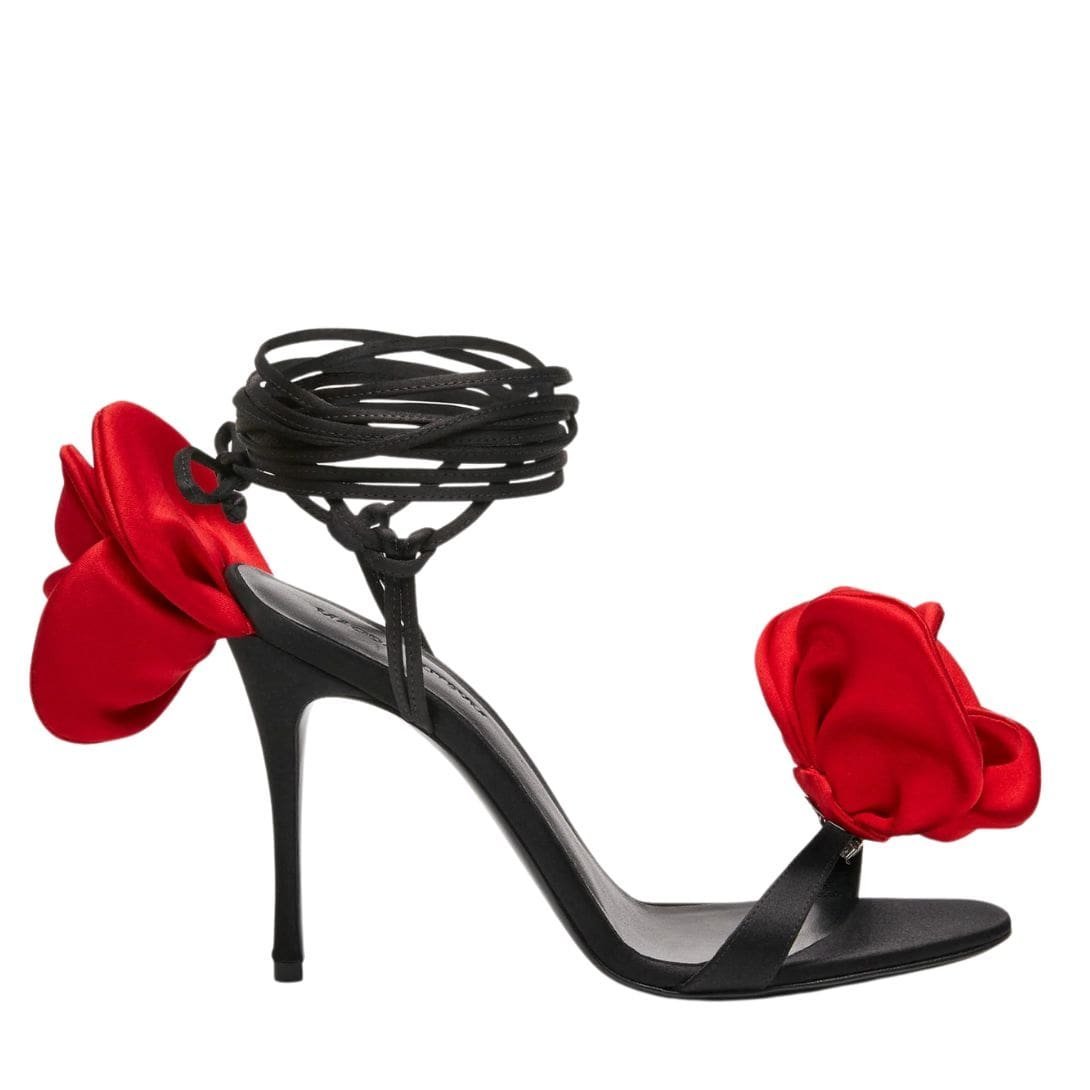 Step into a world of unparalleled elegance and grace with the exquisite MAGDA BUTRYM DOUBLE RED FLOWER HEEL SANDALS IN BLACK SATIN. Crafted to perfection, these sandals are the epitome of refined sophistication, designed to elevate your every step with their timeless charm and intricate detailing.
