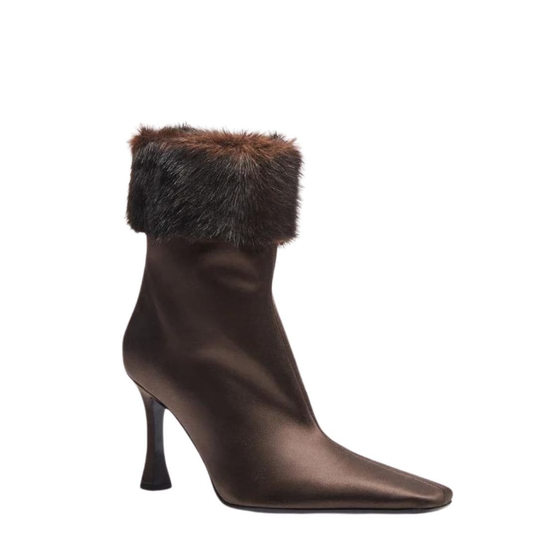 A standout feature of these boots is the faux fur trim, which adds a layer of texture and opulence. The faux fur not only contributes to the boots’ stylish look but also provides additional warmth and comfort, making them ideal for the colder seasons. The plush fur contrasts beautifully with the satin upper, creating a striking visual effect that is both chic and luxurious.