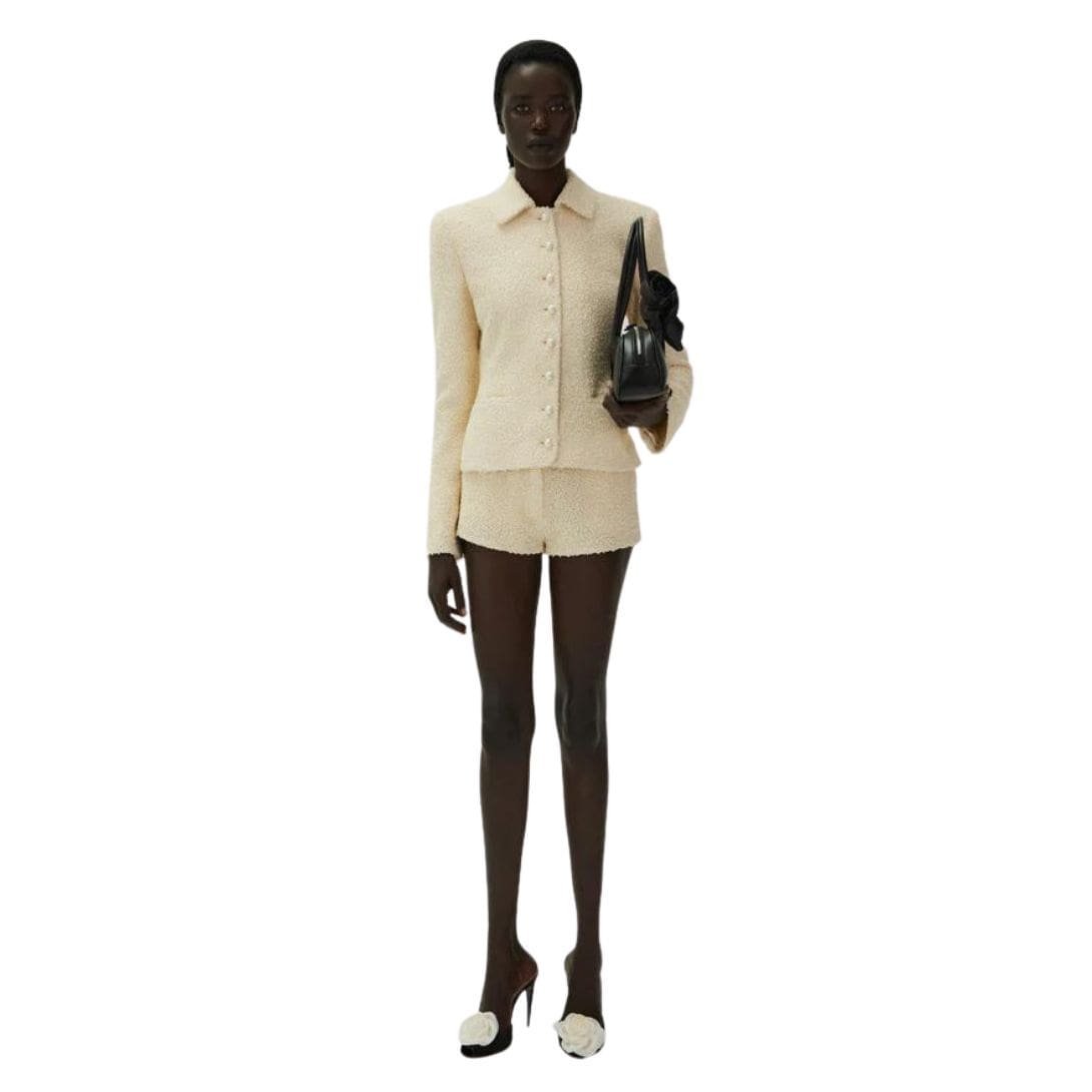 Down the front of the blazer, a row of elegant pearl buttons adds a touch of luxury and class. These buttons are not only functional but also serve as beautiful decorative elements, contrasting delicately against the cream bouclé fabric. The pearl buttons are a signature detail of Magda Butrym, adding an extra layer of opulence to this already exquisite piece.