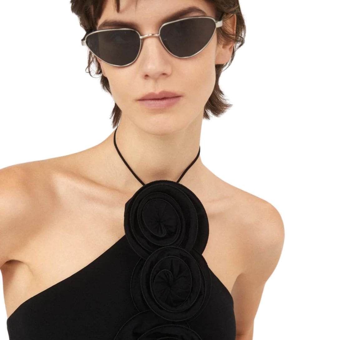 The Magda Butrym Floral Applique jersey tie neck top in black offers a chic and minimalist design elevated by three signature rose appliqués. Crafted from soft jersey fabric, this halter-style top features a strappy tie neckline that adds a touch of sophistication and modern flair.