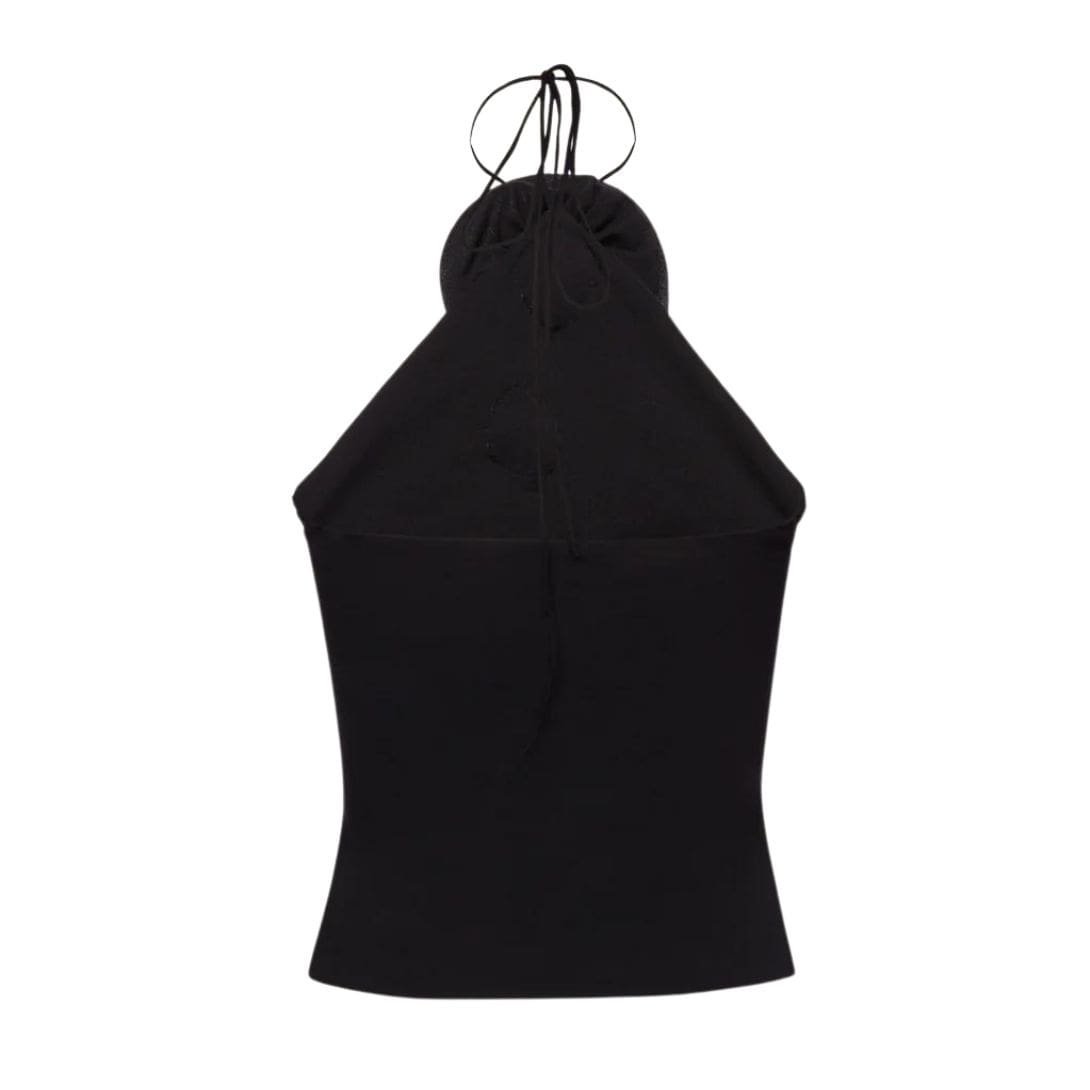 In summary, the Magda Butrym jersey tie-neck top in black combines a simple halter design with intricate rose appliqués, creating a modern and refined silhouette. With its soft jersey fabric and strappy tie neckline, this top is both stylish and comfortable, making it a versatile addition to any wardrobe.