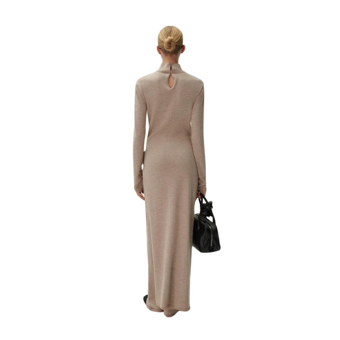 Overall, Magda Butrym’s high-neck knit maxi dress in beige combines timeless elegance with contemporary luxury. Its blend of wool and cashmere, along with exquisite craftsmanship and thoughtful design elements, ensures it stands out as a statement piece for sophisticated wardrobes. Ideal for those who appreciate refined fashion and impeccable quality, this dress promises to elevate any occasion with its effortless sophistication and understated glamour.