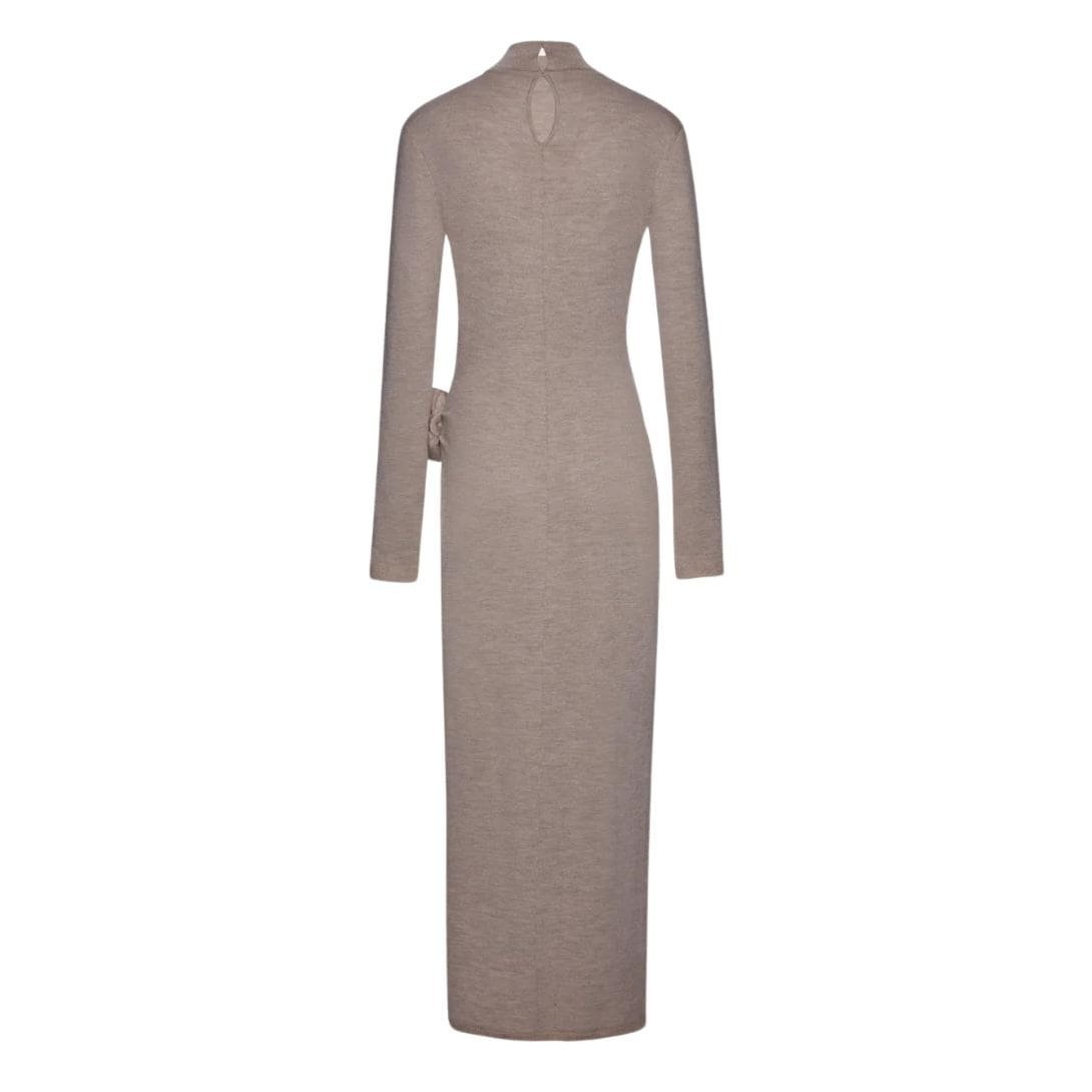 Magda Butrym high neck knit maxi dress in beige exudes refined elegance, featuring a sophisticated silhouette with long sleeves and a side-slit skirt. The dress is gathered at the hip, enhancing the figure, and adorned with intricate 3D flower appliqués for a touch of artistic detail.