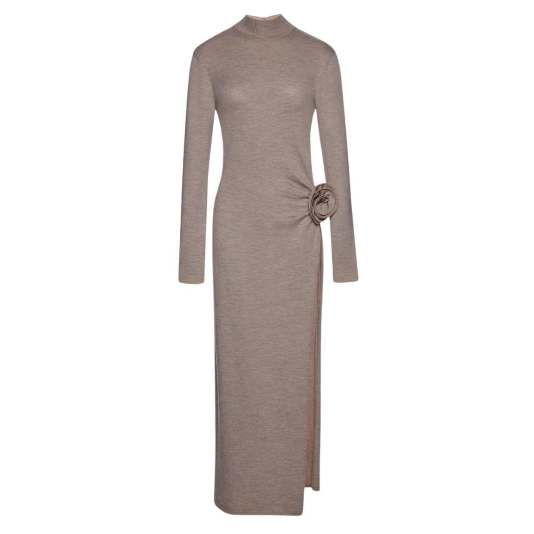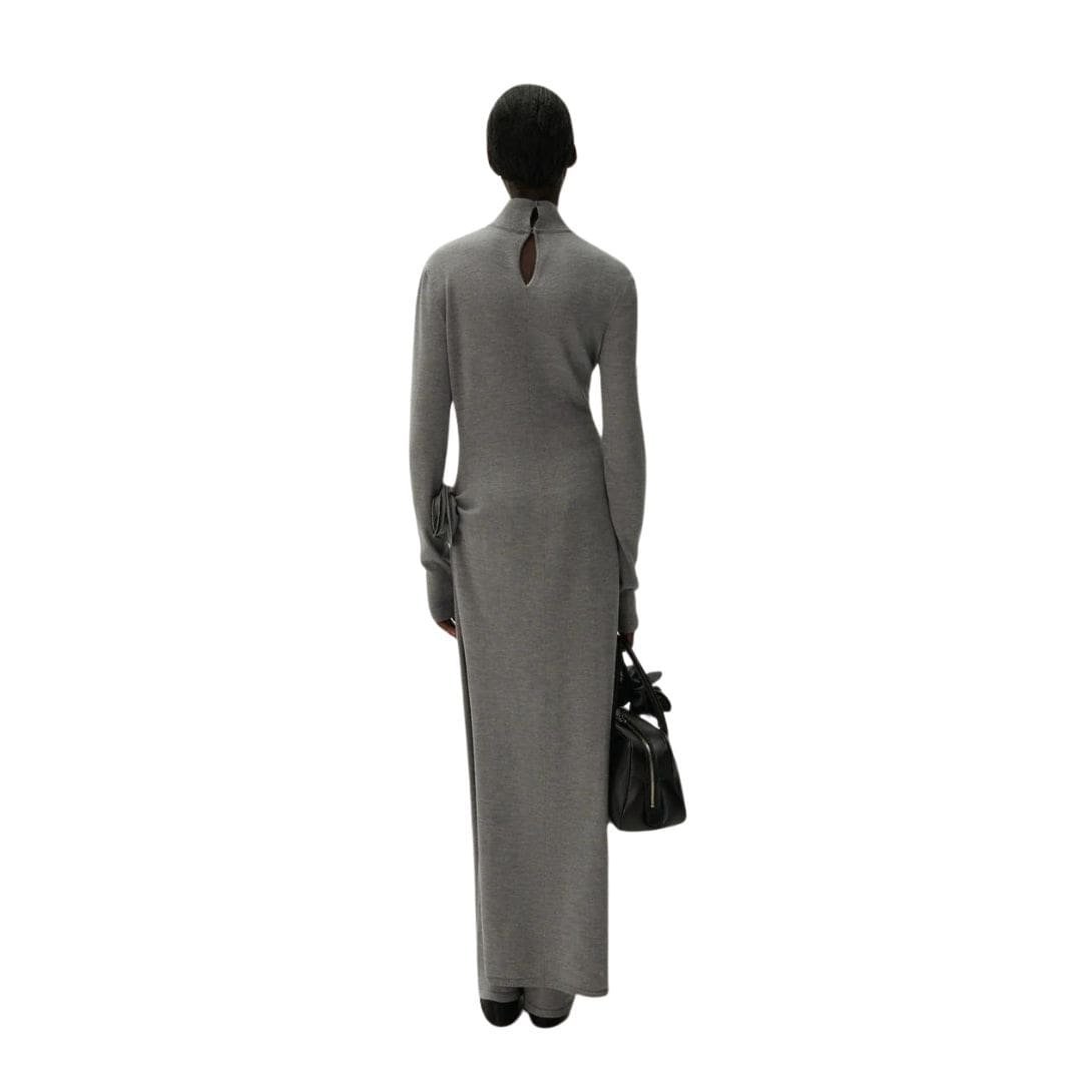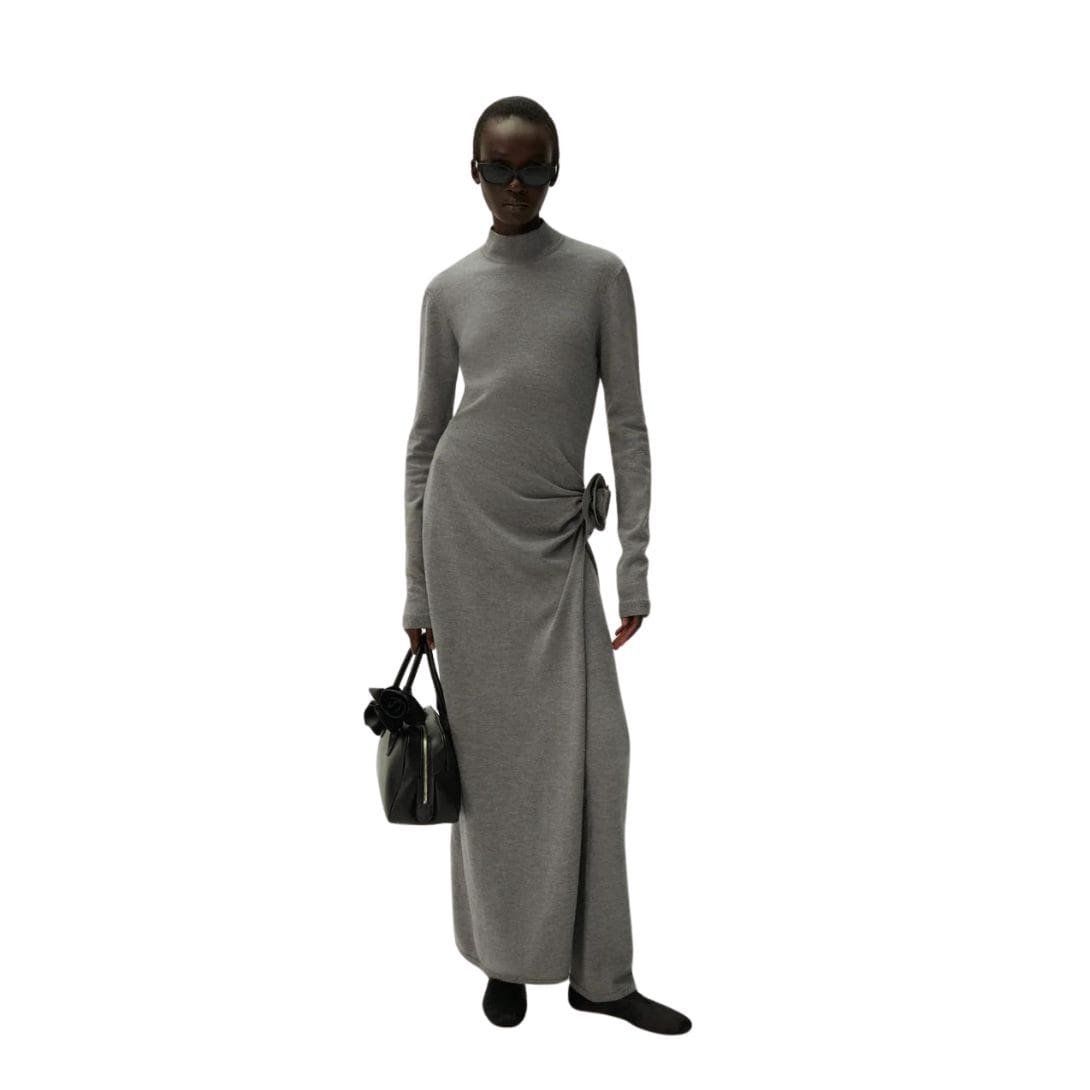 Magda Butrym high neck knit maxi dress in gray exudes refined elegance, featuring a sophisticated silhouette with long sleeves and a side-slit skirt. The dress is gathered at the hip, enhancing the figure, and adorned with intricate 3D flower appliqués for a touch of artistic detail.