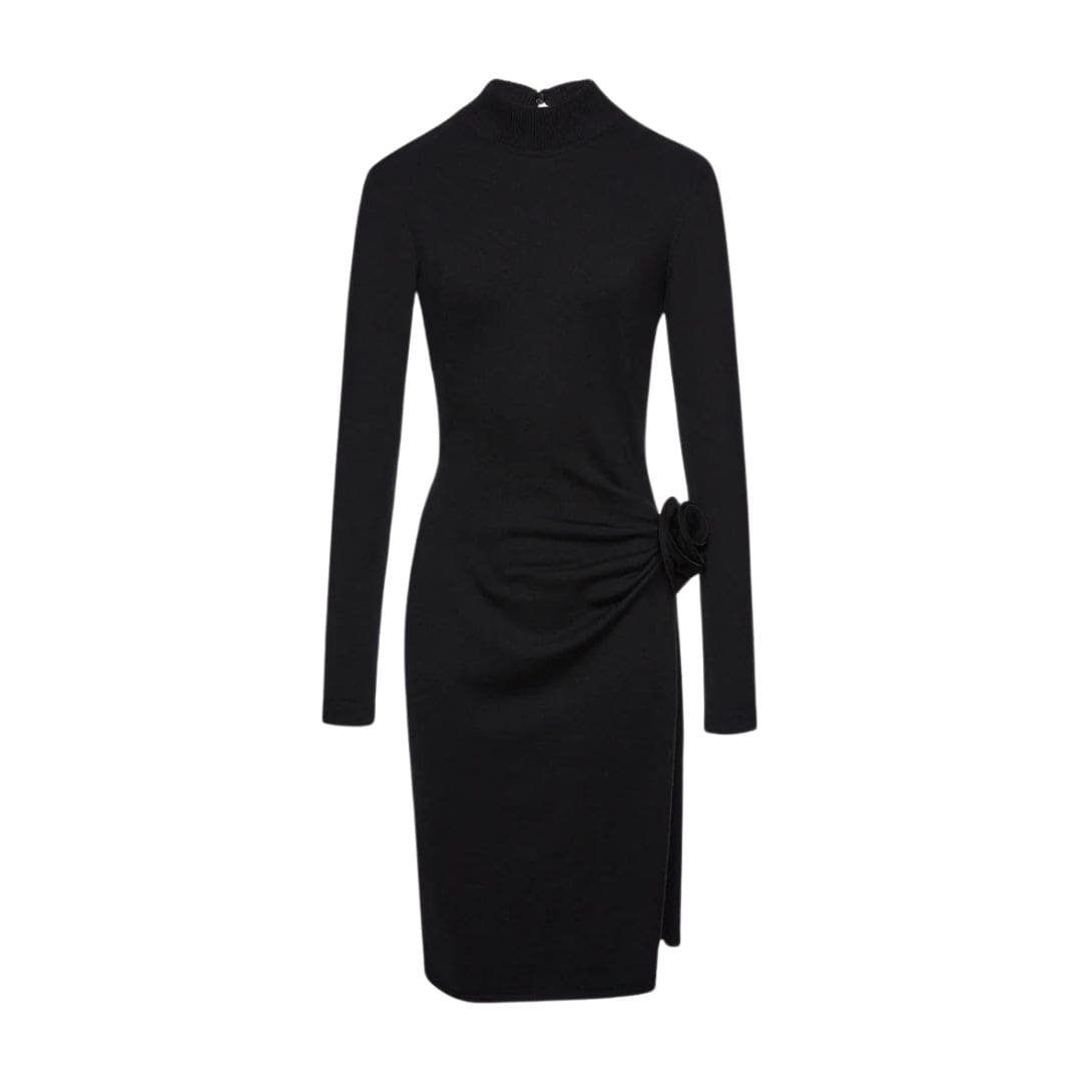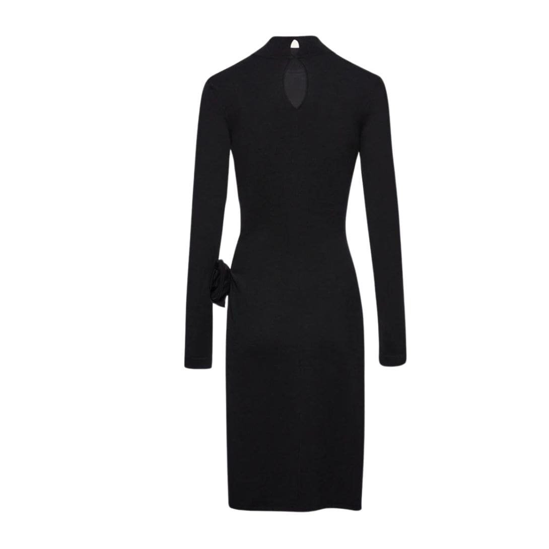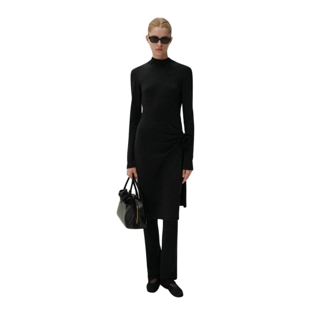 Magda Butrym high neck knit midi dress in black exudes refined elegance, featuring a sophisticated silhouette with long sleeves and a side-slit skirt. The dress is gathered at the hip, enhancing the figure, and adorned with intricate 3D flower appliqués for a touch of artistic detail.