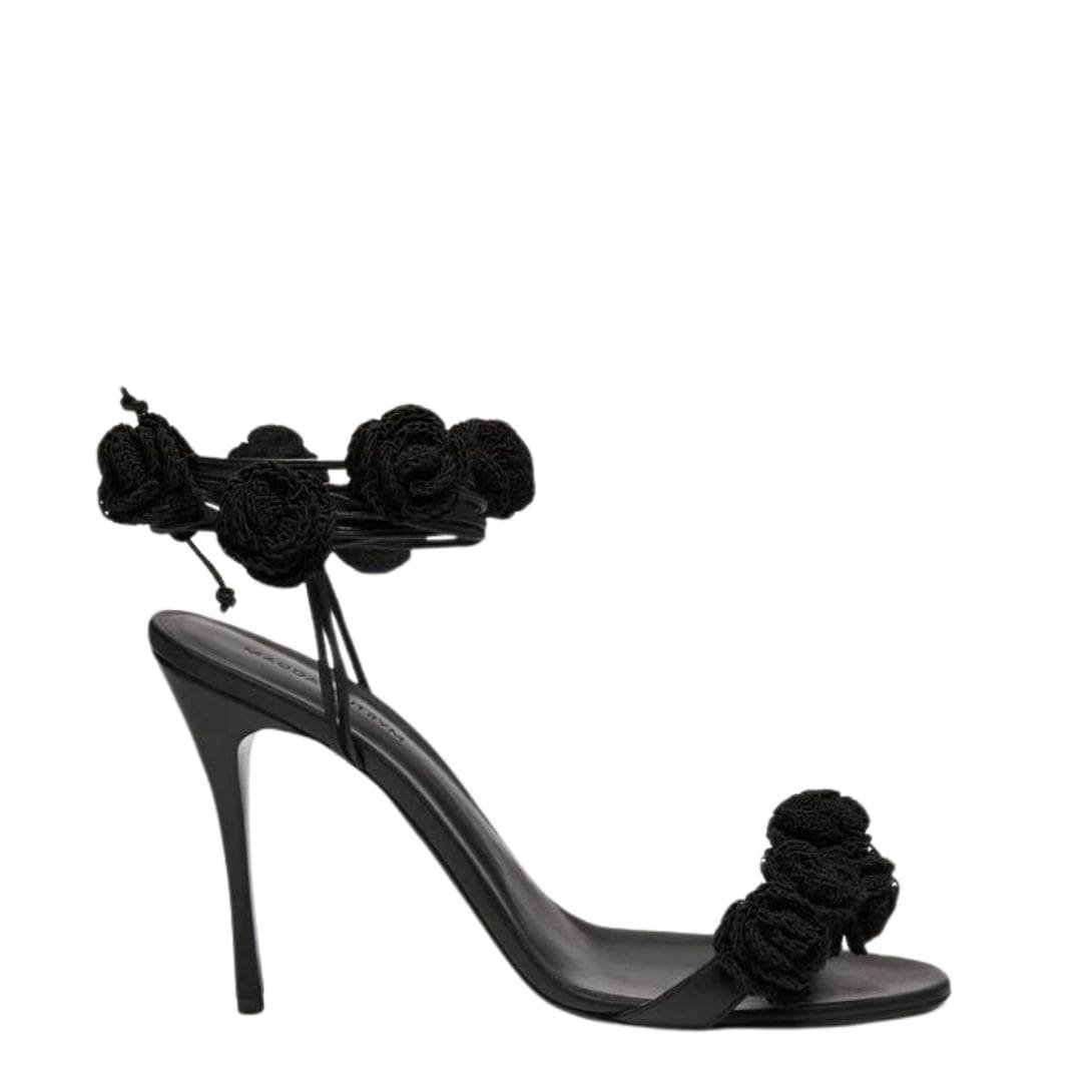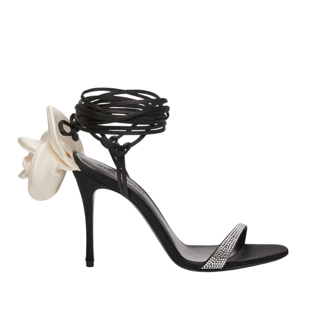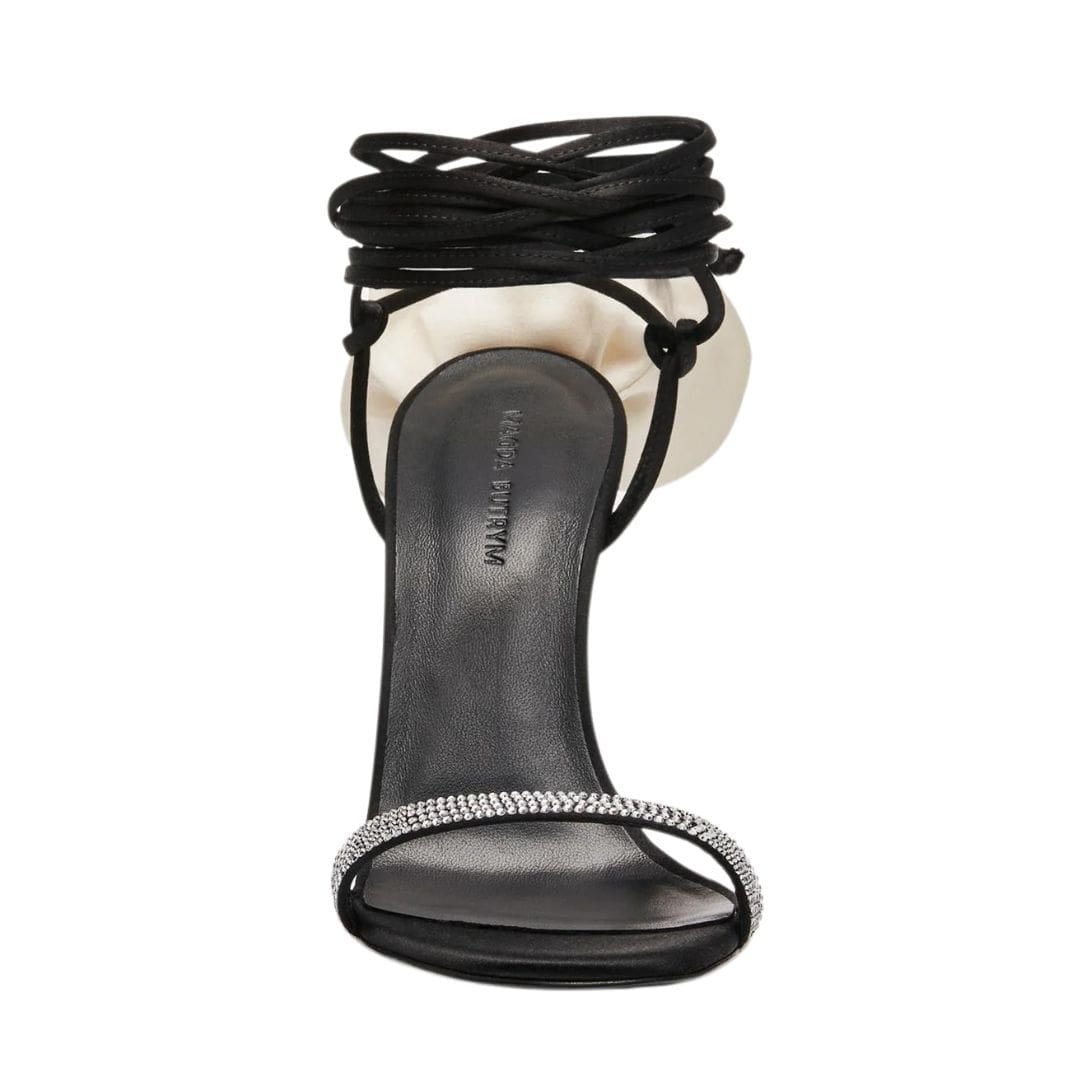 MAGDA BUTRYM IVORY FLOWER WRAP AROUND BLACK SATIN HEEL SANDALS WITH STRASS