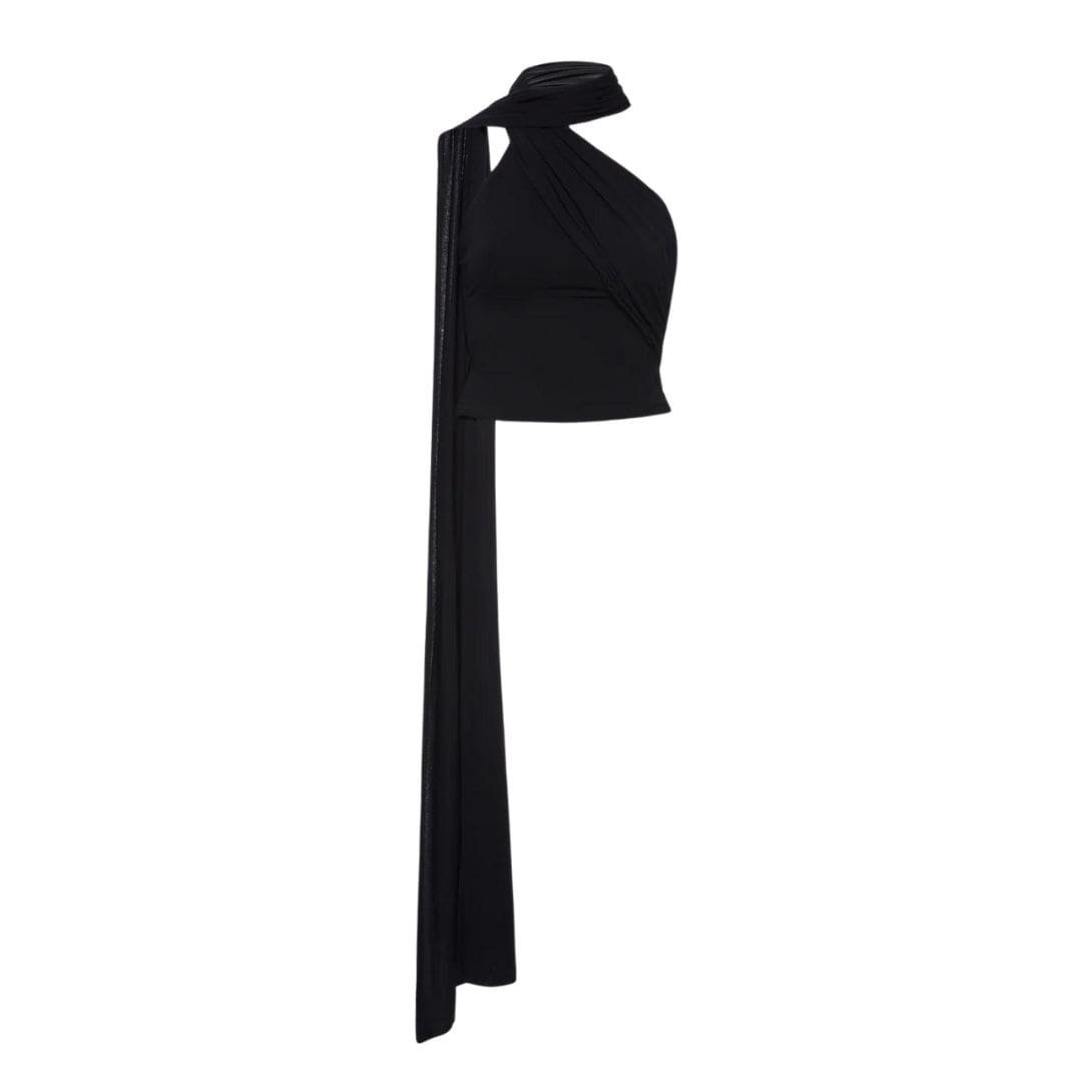 In summary, Magda Butrym’s black jersey wrap neck top is a season’s must-have, offering a blend of modern elegance and dramatic style. With its wrap-around neck detailing and long sash, this top adds a touch of glamour to any outfit. Crafted from jersey fabric, it provides both comfort and a flattering fit, making it a versatile and stylish addition to your collection.