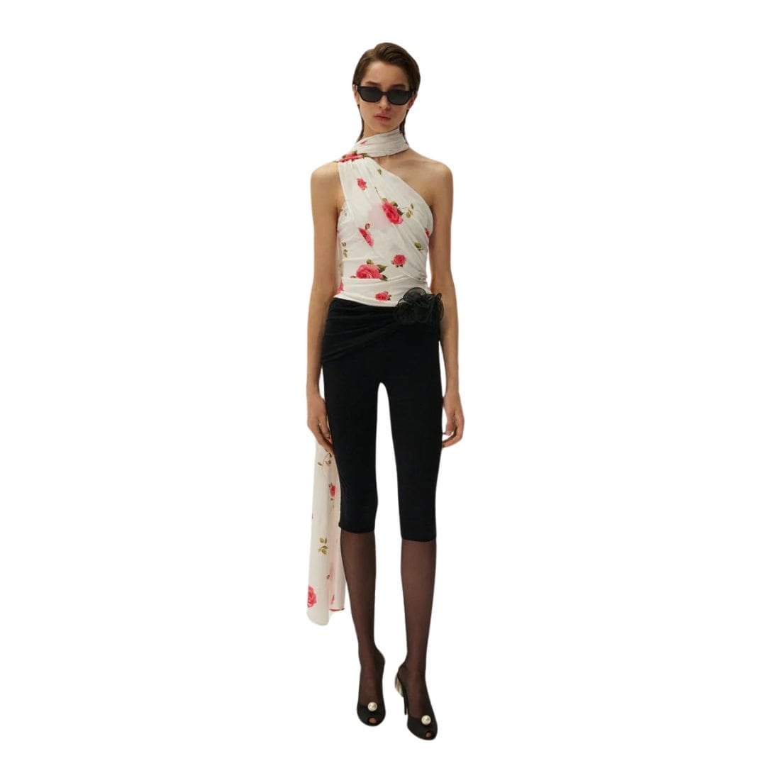 This season, Magda Butrym Jersey Wrap neck top In Cream Print introduces a must-have piece with the jersey wrap neck top in black, featuring an elegant wrap-around neck detail that creates a glamorous scarf effect. The long sash adds a dramatic touch, making this top a standout addition to any wardrobe.