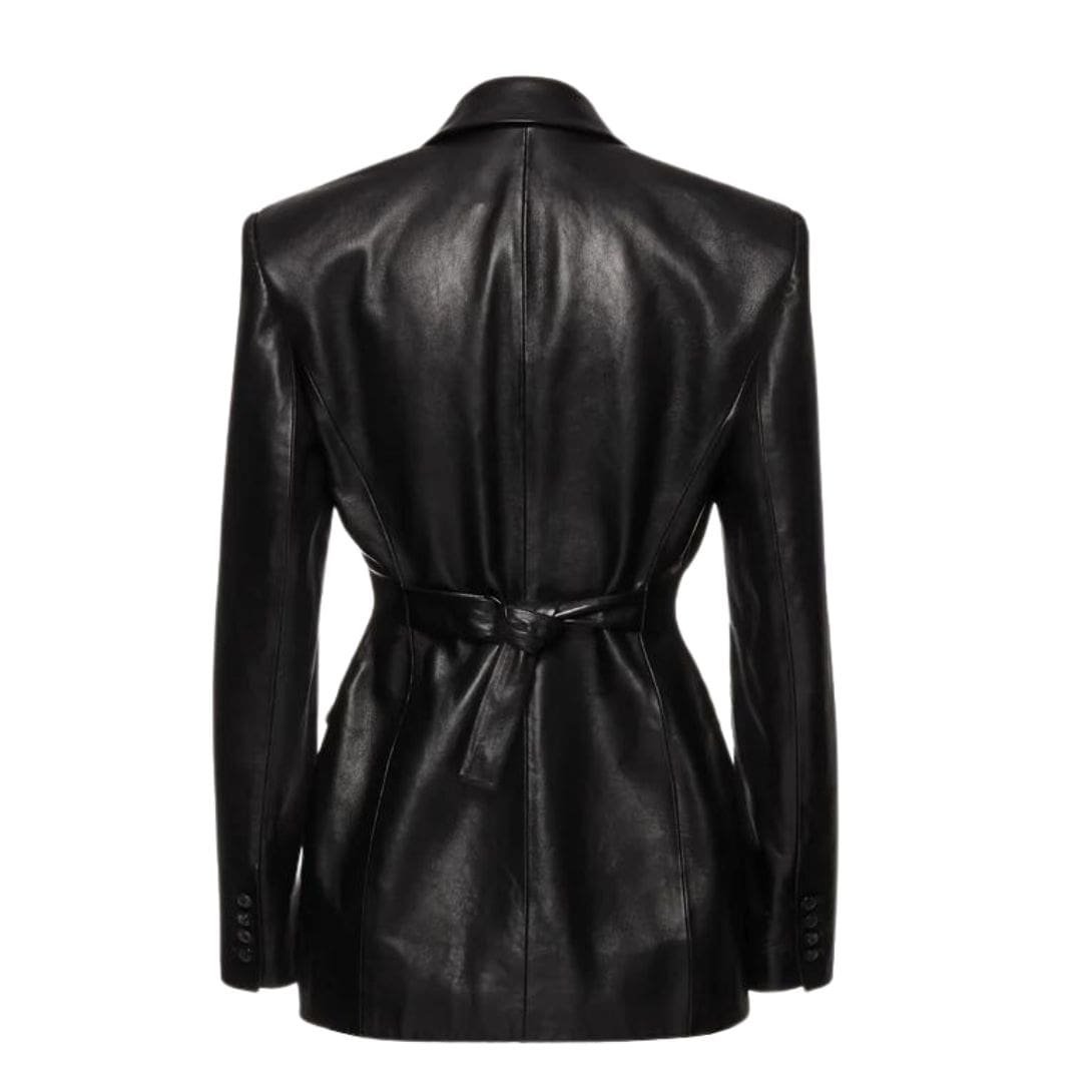 Crafted from premium leather, this blazer exudes luxury and refinement. The supple leather fabric not only feels luxurious to the touch but also adds a sense of edgy sophistication to the overall design. Its sleek and smooth texture enhances the modern aesthetic of the blazer, making it a standout piece that demands attention.