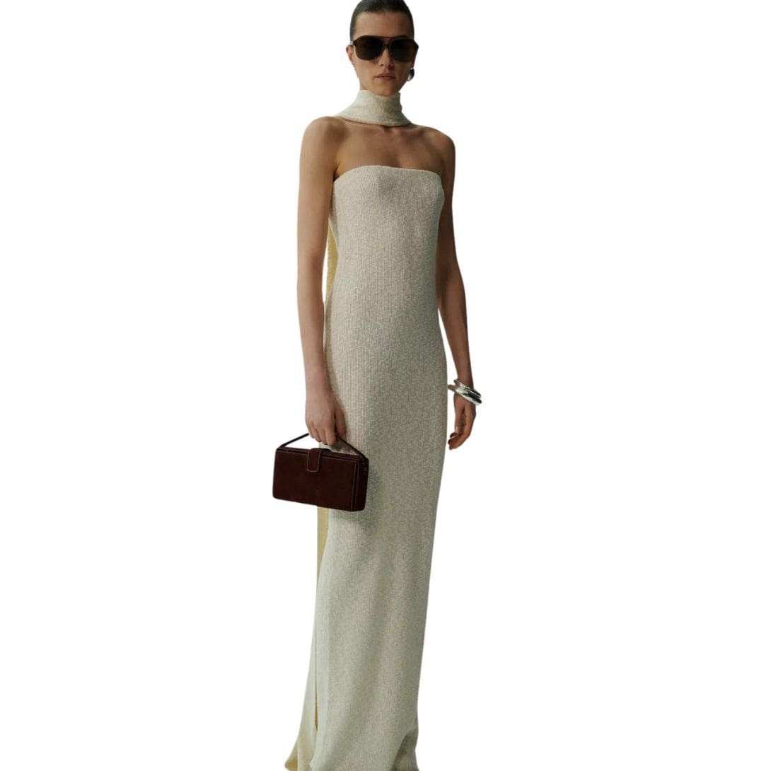 Magda Butrym linen knit tube scarf maxi dress in cream epitomizes casual elegance, crafted from a lightweight blend of linen and cotton. This dress features a strapless neckline and a form-fitting silhouette that accentuates the body’s natural curves.