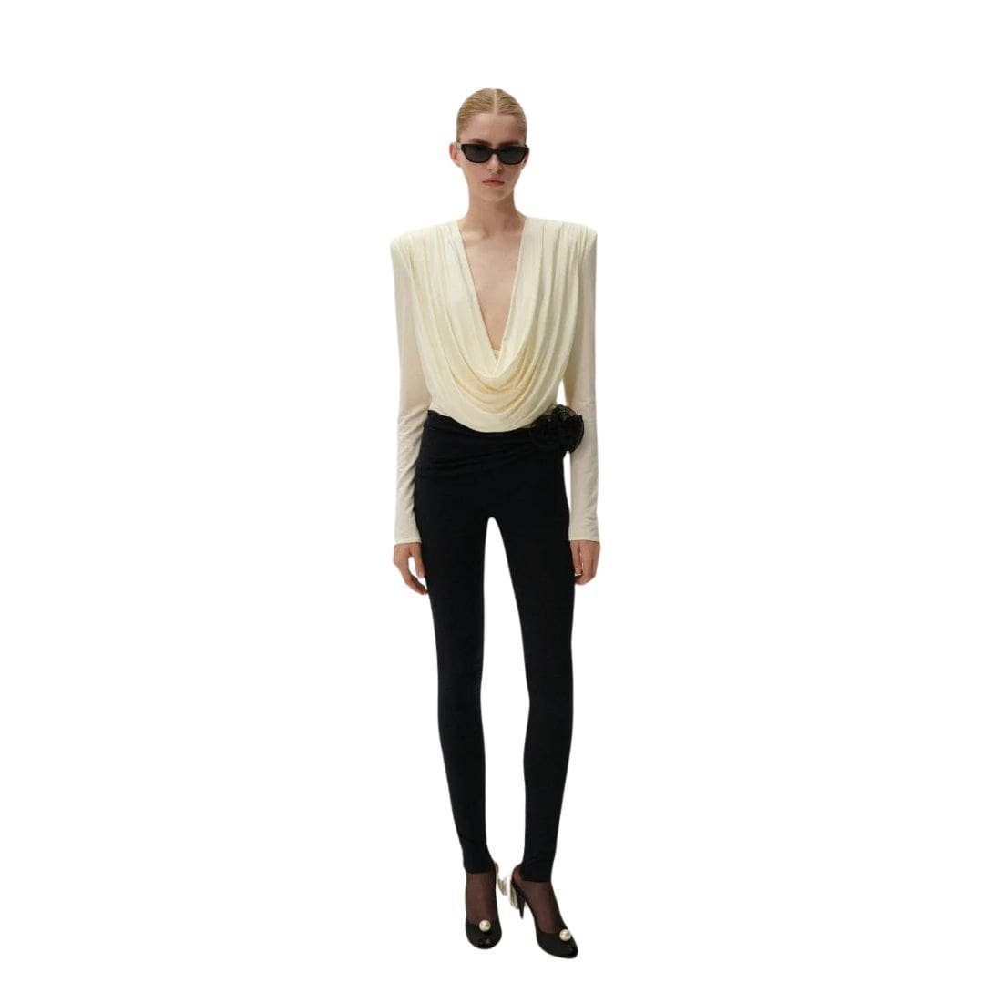 Magda Butrym’s attention to detail is evident in the thoughtful design of this blouse. The combination of the draped neckline, long sleeves, and removable shoulder pads creates a modern and sophisticated aesthetic. Whether paired with tailored trousers for a professional look or with jeans for a casual outing, this blouse effortlessly transitions between day and evening wear.