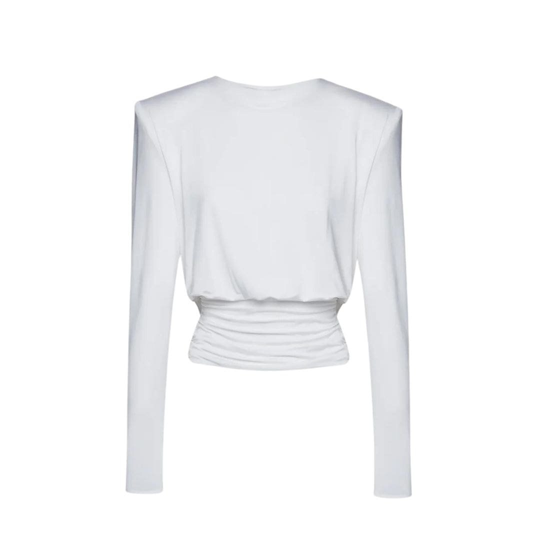 Magda Butrym’s attention to detail is evident in the craftsmanship of this blouse. The combination of the draped neckline and long sleeves creates a refined and understated aesthetic, perfect for creating sophisticated looks. Whether paired with tailored trousers for a professional ensemble or with jeans for a chic casual outfit, this silk blouse is a versatile wardrobe staple.