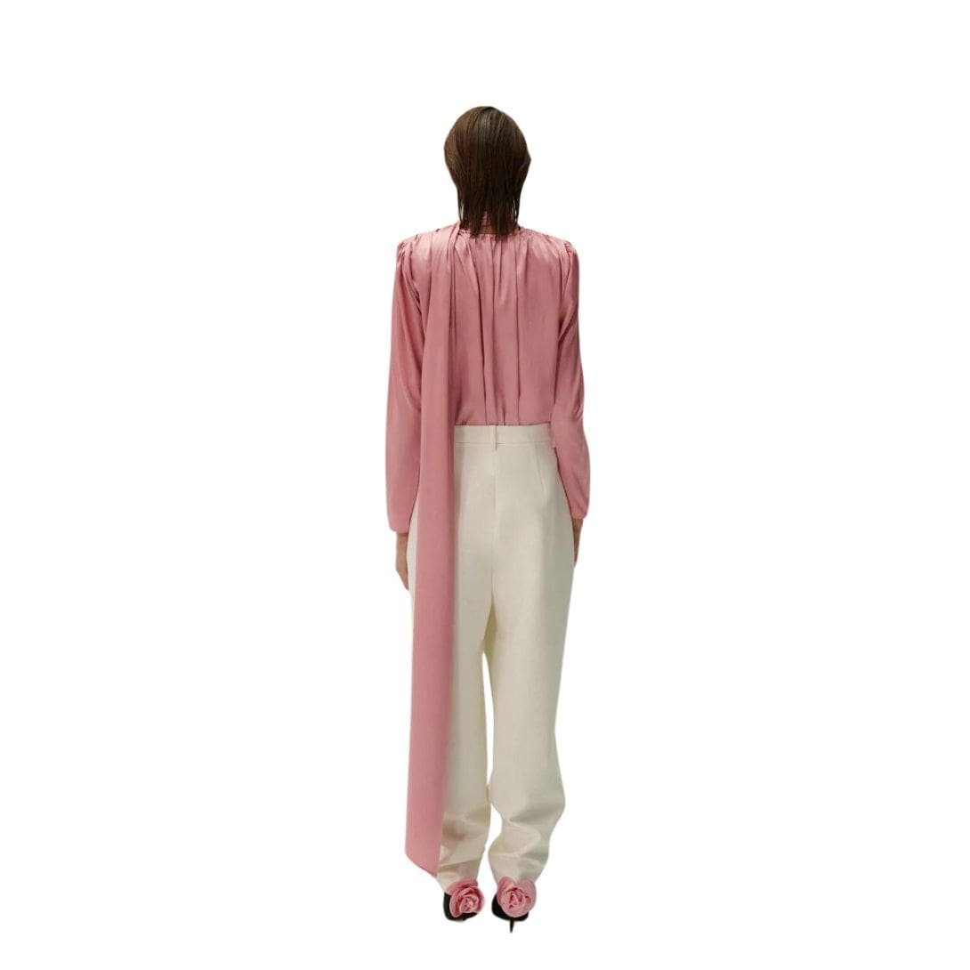 In summary, Magda Butrym’s pink long sleeve draped silk blouse combines luxurious silk fabric with a flattering draped neckline and long sleeves. It offers comfort, elegance, and versatility, making it a timeless addition to any wardrobe for those seeking refined and sophisticated style.