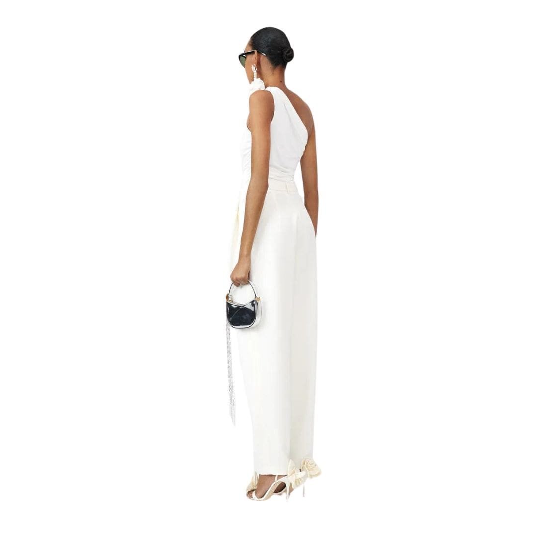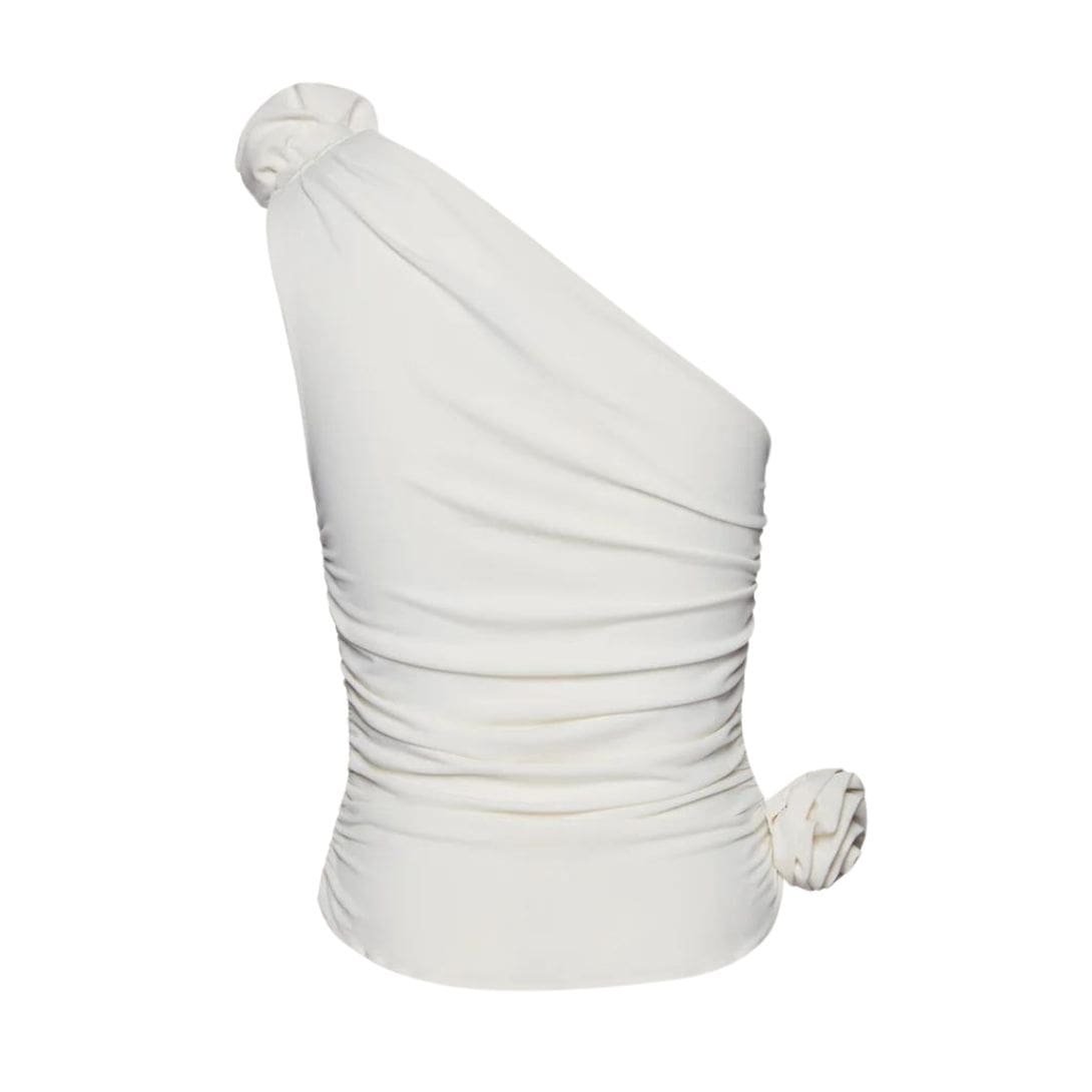 Magda Butrym One Shoulder T Shirt In Cream redefines the classic t-shirt with a contemporary twist: a lightweight, asymmetrical one-shoulder top featuring ruched detailing and 3D cotton roses. This modern interpretation combines casual comfort with high fashion elements, offering a unique and stylish look.
