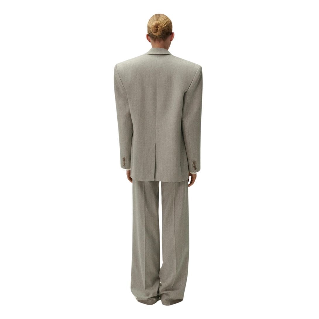 Magda Butrym, known for her impeccable craftsmanship and innovative designs, has redefined the classic blazer with her signature touch of elegance and sophistication. This season, she presents a stunning iteration of the oversized double-breasted blazer in a timeless shade of lightweight grey wool.