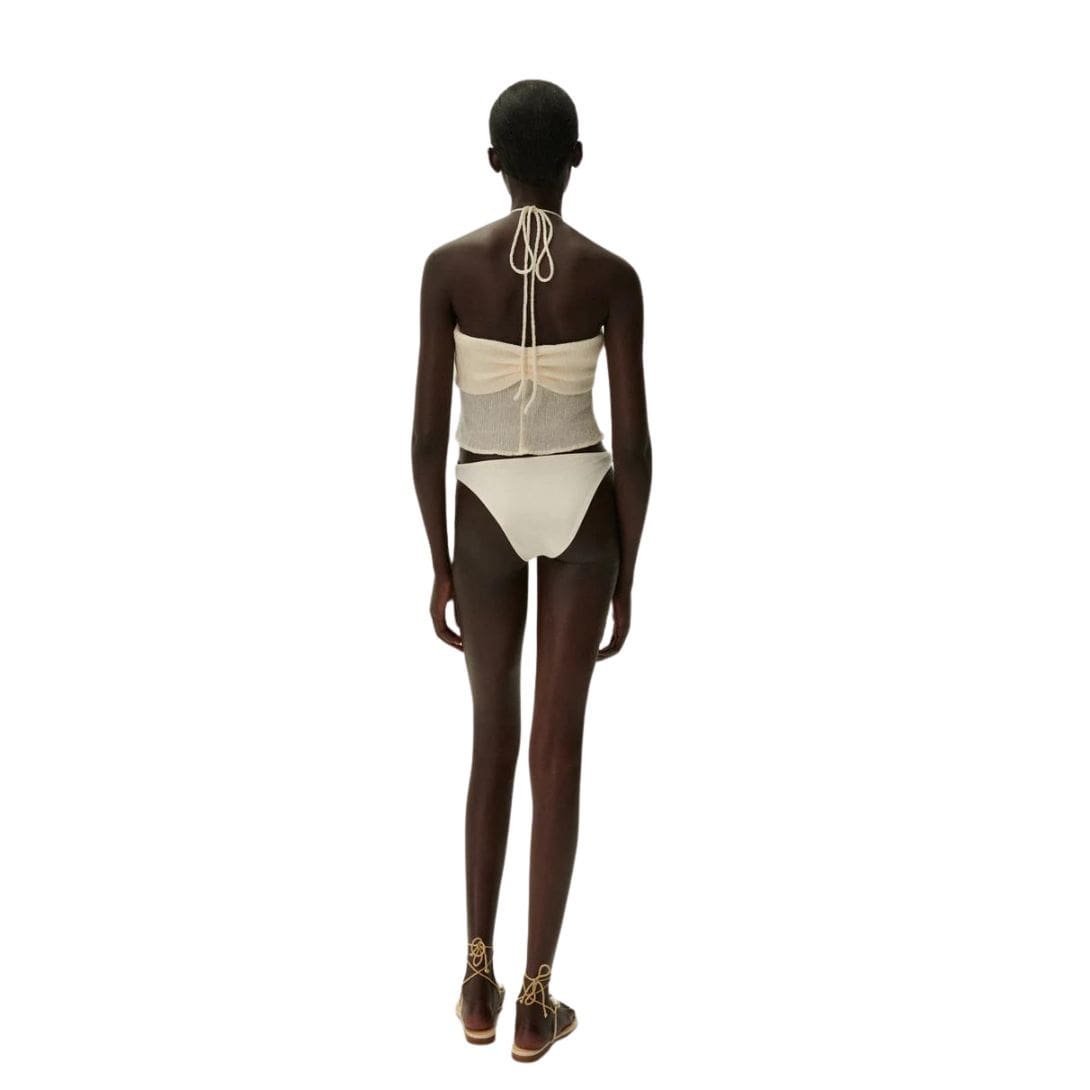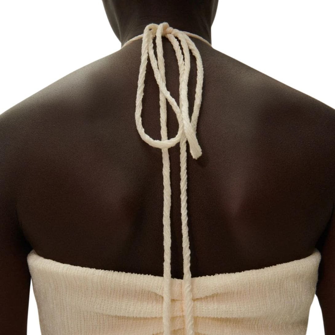 Inspired by the 2000s, Magda Butrym Pearl Halterneck Tube Top In Cream is adorned at the neckline with oversized pearls on halter straps, creating a glamorous halterneck look. Crafted from lightweight, textured fabric, this versatile piece seamlessly transitions from beachwear to evening attire, making it an essential addition to any holiday wardrobe.