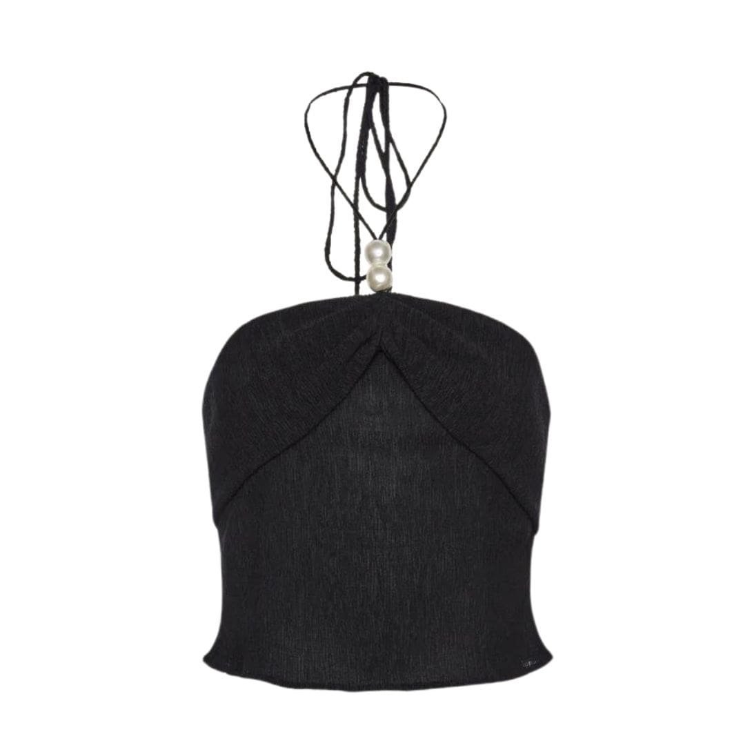 The halterneck design adds a touch of sophistication, accentuating the shoulders and neckline while providing a secure and comfortable fit with the tie-up straps. The XL pearls embellishment along the straps enhances the top’s visual appeal, adding a luxurious and fashionable element to the ensemble.