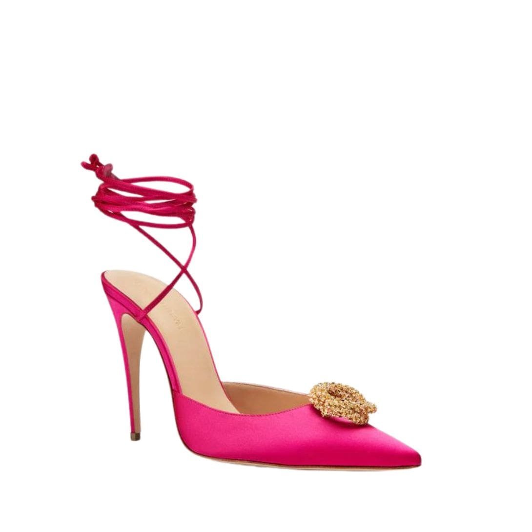 In summary, the Magda Butrym Pointed-Toe Satin Mile Wrap Pumps in Fuchsia are a masterpiece of modern design and classic elegance. The combination of the pointed-toe profile, wrap-around ankle ties, and high stiletto heel creates a vibrant and sophisticated silhouette. Crafted with 100% silk upper and leather components, these pumps offer both luxury and comfort, making them an essential addition to any fashion-forward wardrobe.