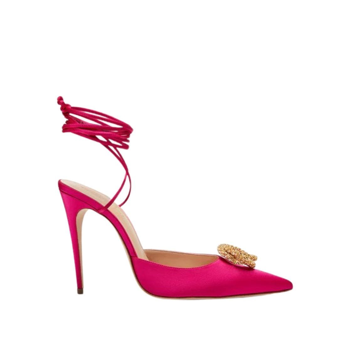 The Magda Butrym Pointed-Toe Satin Mile Wrap Pumps in fuchsia. are a striking example of sophisticated elegance and modern design. These pumps are meticulously crafted in Italy, a country celebrated for its exceptional footwear craftsmanship. Each pair of pumps embodies the highest standards of quality and attention to detail, making them a luxurious addition to any wardrobe.